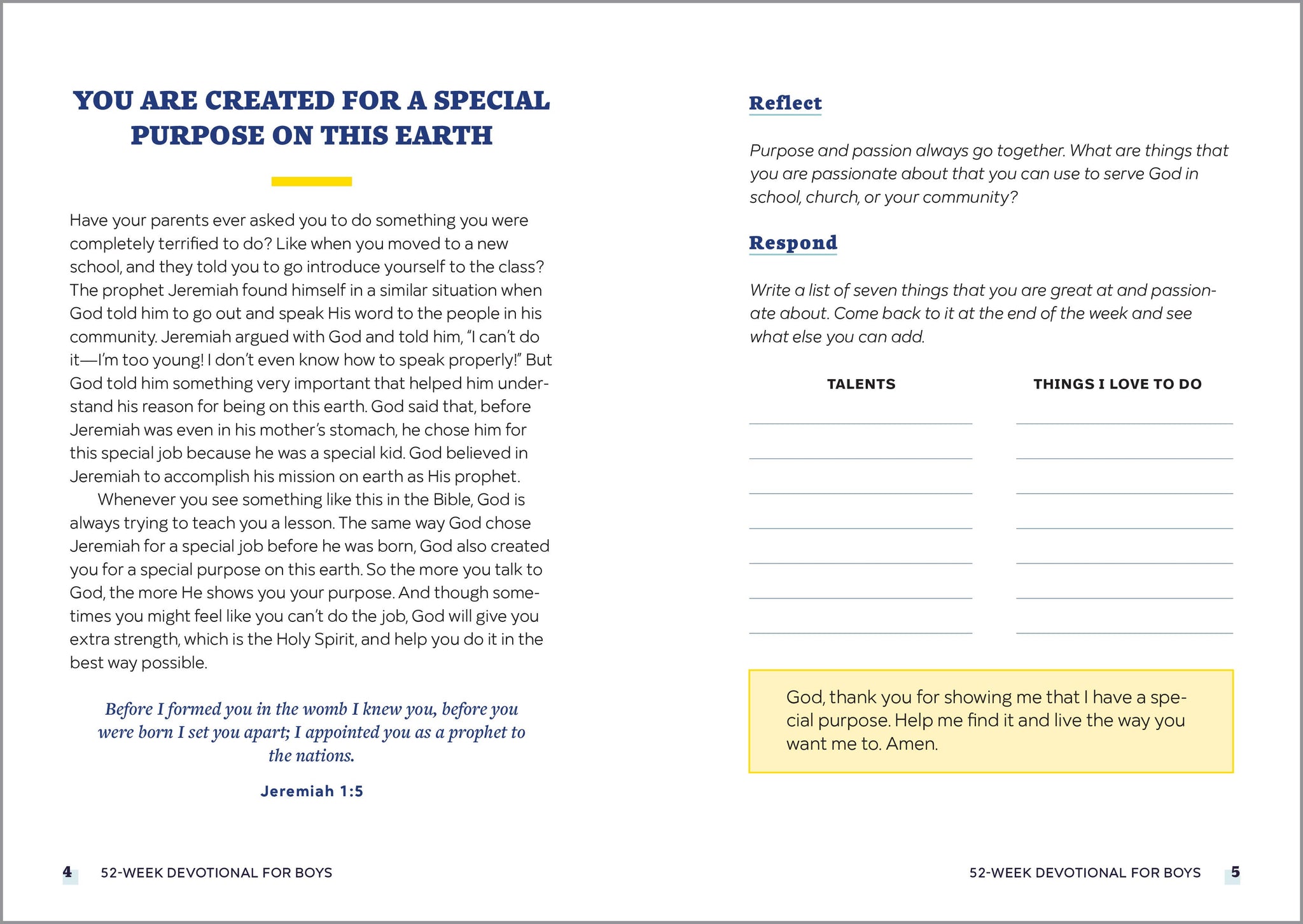 Off-the-page ideas—This boys’ devotional includes weekly ideas to put into action, like encouraging them to have heartfelt conversations with family.