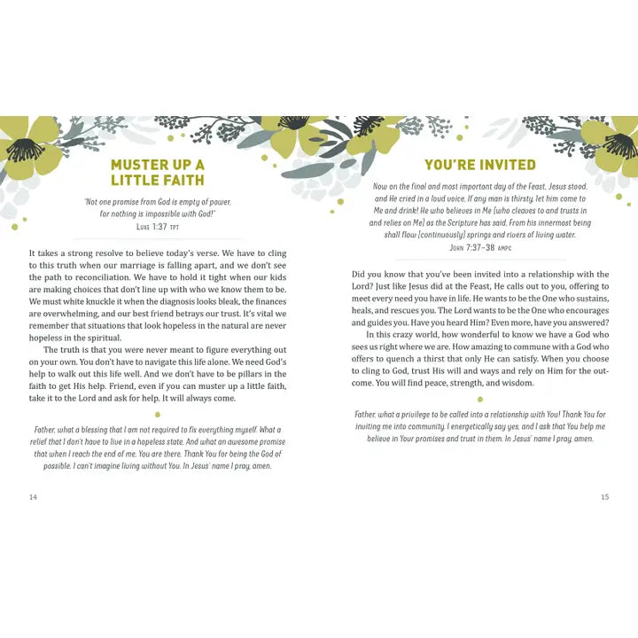 Tiny Faith Can Move Mountains! Want to increase your faith? . . .This beautiful devotional offers just the encouragement, inspiration, and biblical truth you need. 180 full-length devotional readings touch on topics important to you, including: Prayer God's faithfulness God's love Troubles Uncertainty Anxiety Doubt Trust And more!