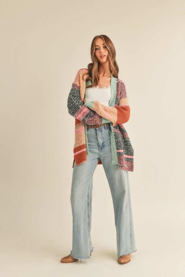 Putting together cute and casual outfits are so easy with this color block cardigan! Perfectly knitted with mixed textured knit throughout, this must-have cardigan is shaped by an open front and drop shoulder long sleeves. The slouchy silhouette has all-over color blocking for that ultra trendy look! Pair with jeans or layer over a dress - you can’t go wrong with this charming cardigan!