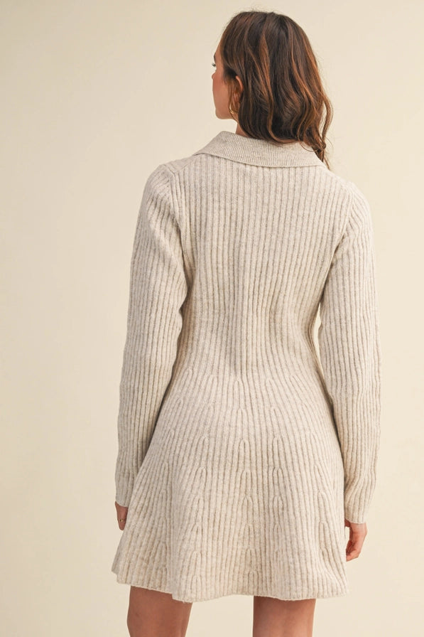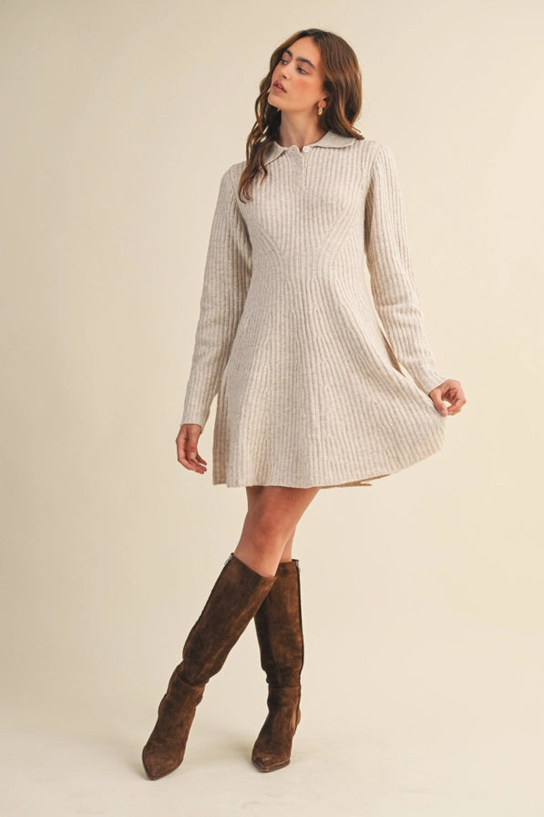 The Audrey Sweater Dress strikes that perfect balance between cozy and put-together. Ribbed knit construction, a chic collared neckline, and long sleeves keep things classic, while the flared skirt adds just enough movement and personality.