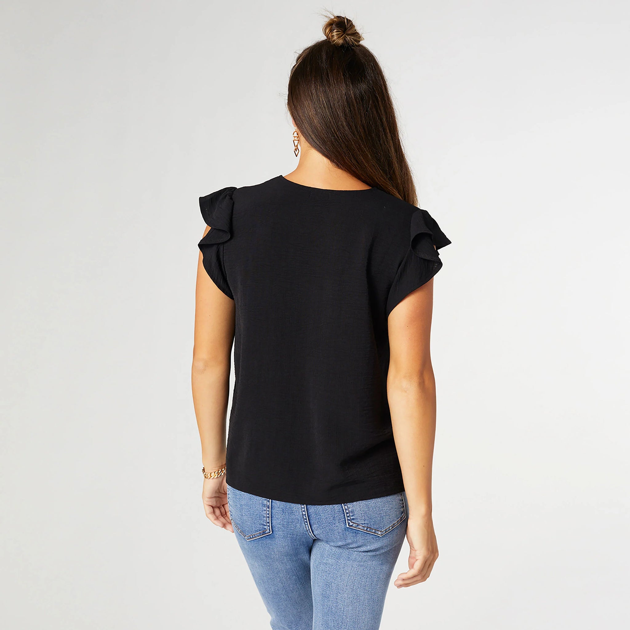 Fall in love with the effortlessly chic Daphne Flutter Sleeve Top. Its soft texture and beautiful drape will make you feel like you're floating on air. Perfect for any occasion, this top is a must-have in your wardrobe.