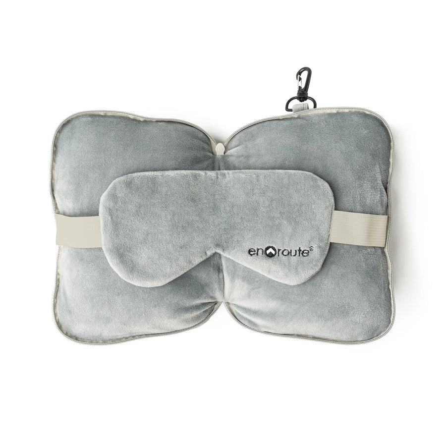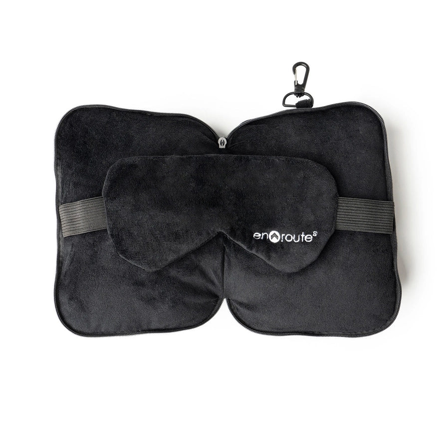- Compact travel pillow + attached sleep mask