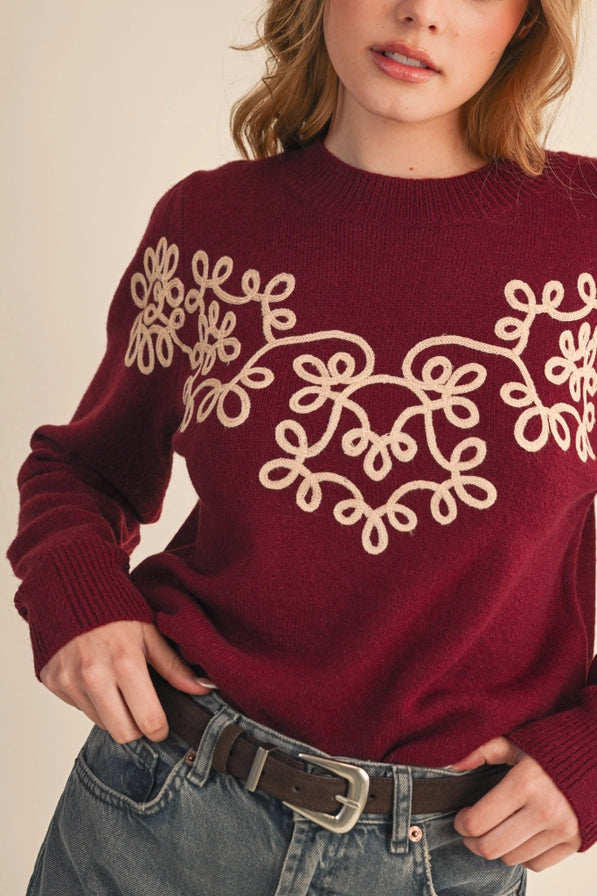 Wrap yourself in autumn charm with this cozy knit sweater featuring a soft rounded neckline and delightful whimsical pattern. Effortlessly stylish and wonderfully comfortable, it's your new go-to for those crisp-weather days when you want to feel both snug and put-together.