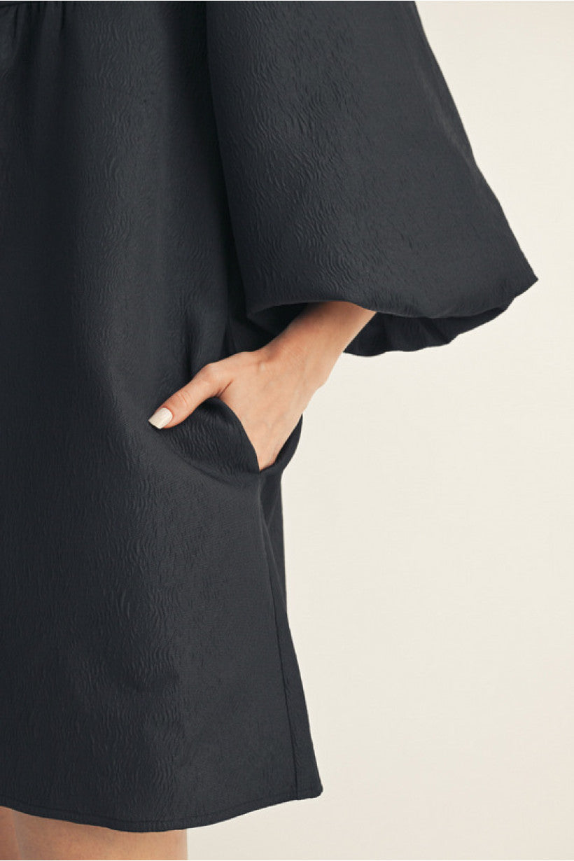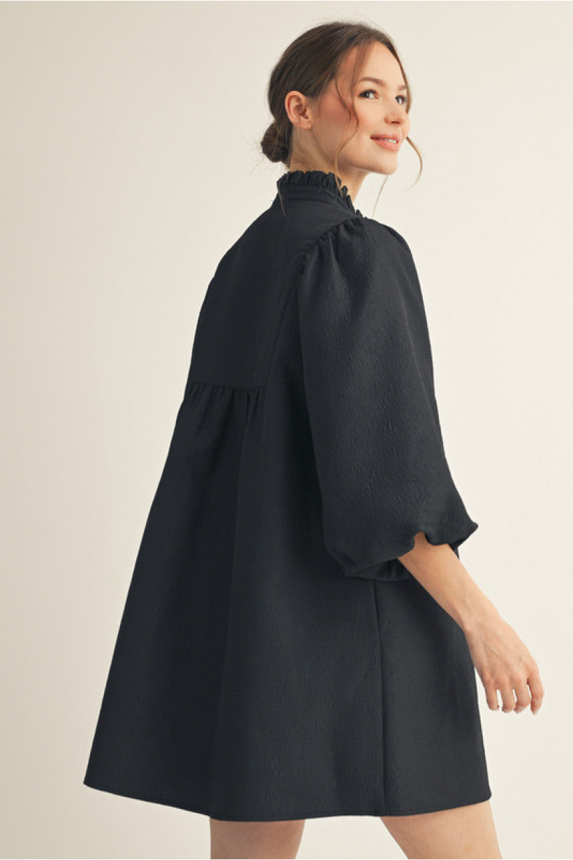 The Kimmie Babydoll Dress brings effortless charm to any occasion. Featuring a flattering v-neck, voluminous balloon sleeves, and a playful babydoll silhouette, this black dress transitions seamlessly from casual to dressed-up moments. The collared neckline adds a polished touch, making it the perfect piece for special events or everyday elegance.