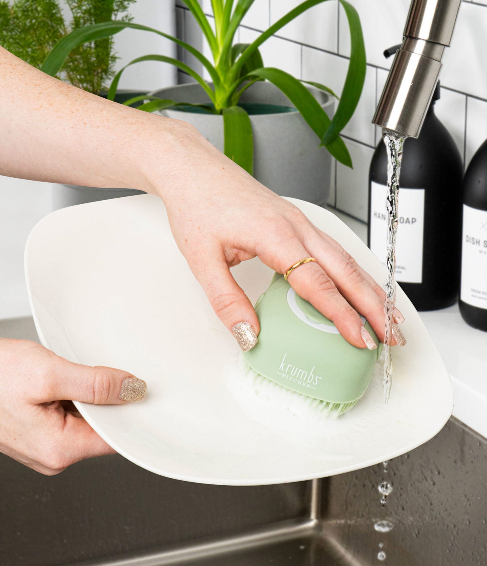 Scrub the grub with a silicone dish scrubber that stores dish soap on demand.