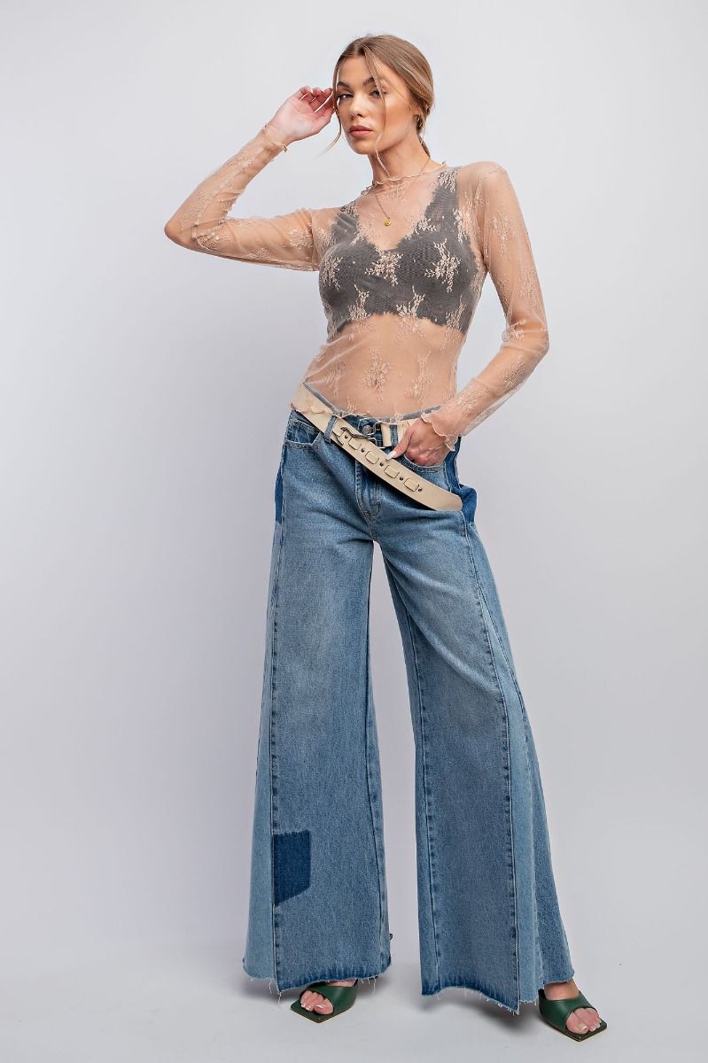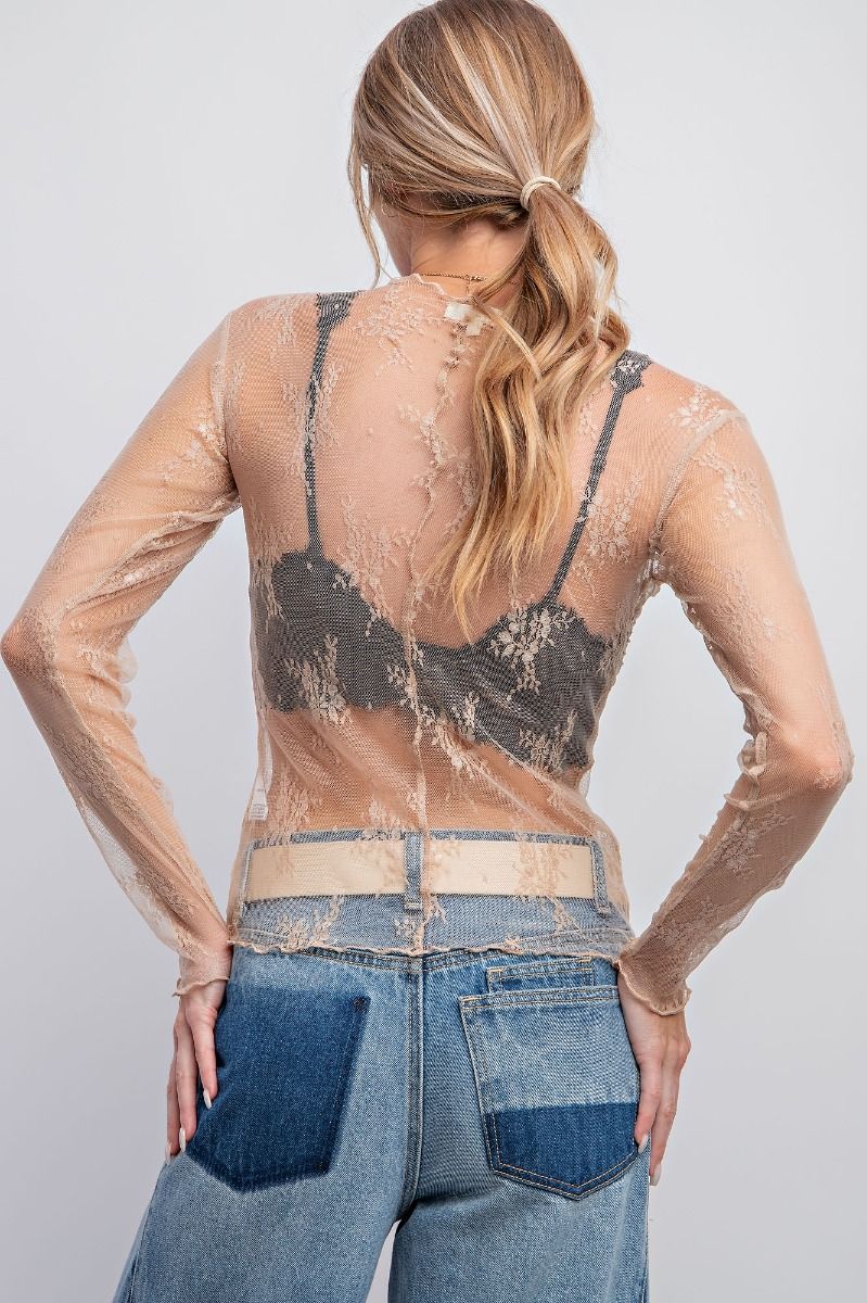 Our new Lace Love Sheer Top in nude features sheer material and delicate lace details, making it the perfect piece for layering. Add depth and a touch of elegance to any outfit with this effortlessly chic top.