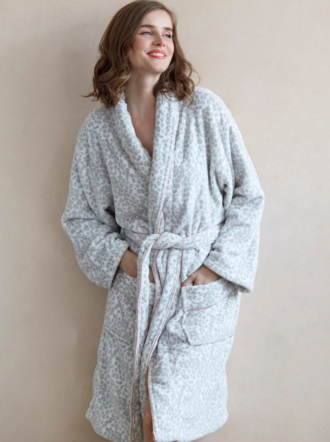 Add a comfortable yet luxe touch to your sleepwear with our new Lelo Robe. This robe features a soft grey and white leopard print and a pink piping detail giving it a extra feminine touch. It also has a wrap around belt and two front pockets. Made from polyester, this cozy robe will provide a smooth and warm touch against your skin.