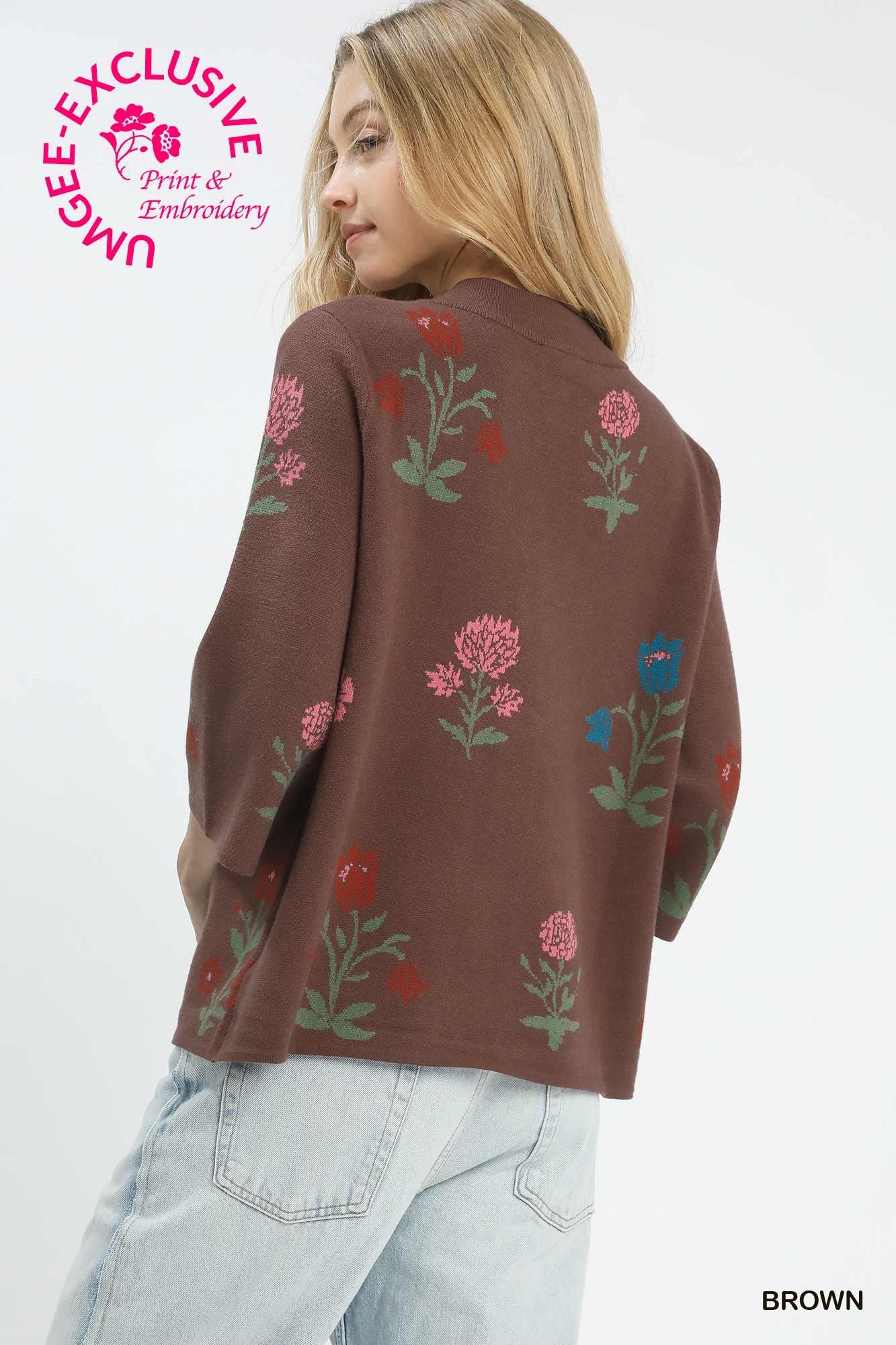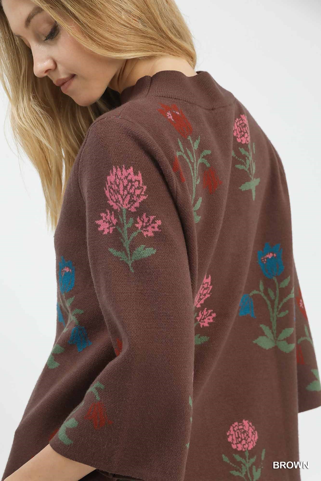 The Dawn Floral Knit Sweater in Brown features cozy fall florals and a relaxed fit for effortless comfort. Its wide sleeves and mock neck add playful touches to this easygoing, stylish layer perfect for crisp autumn days.