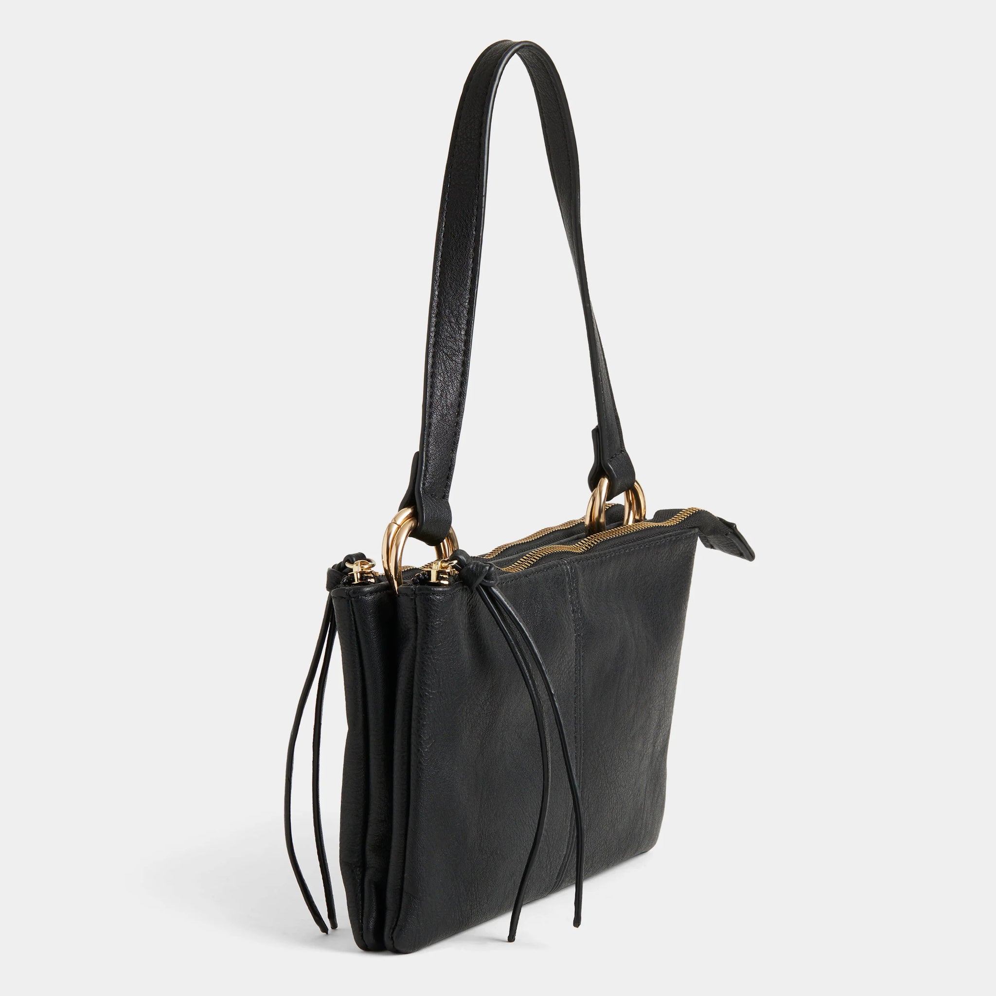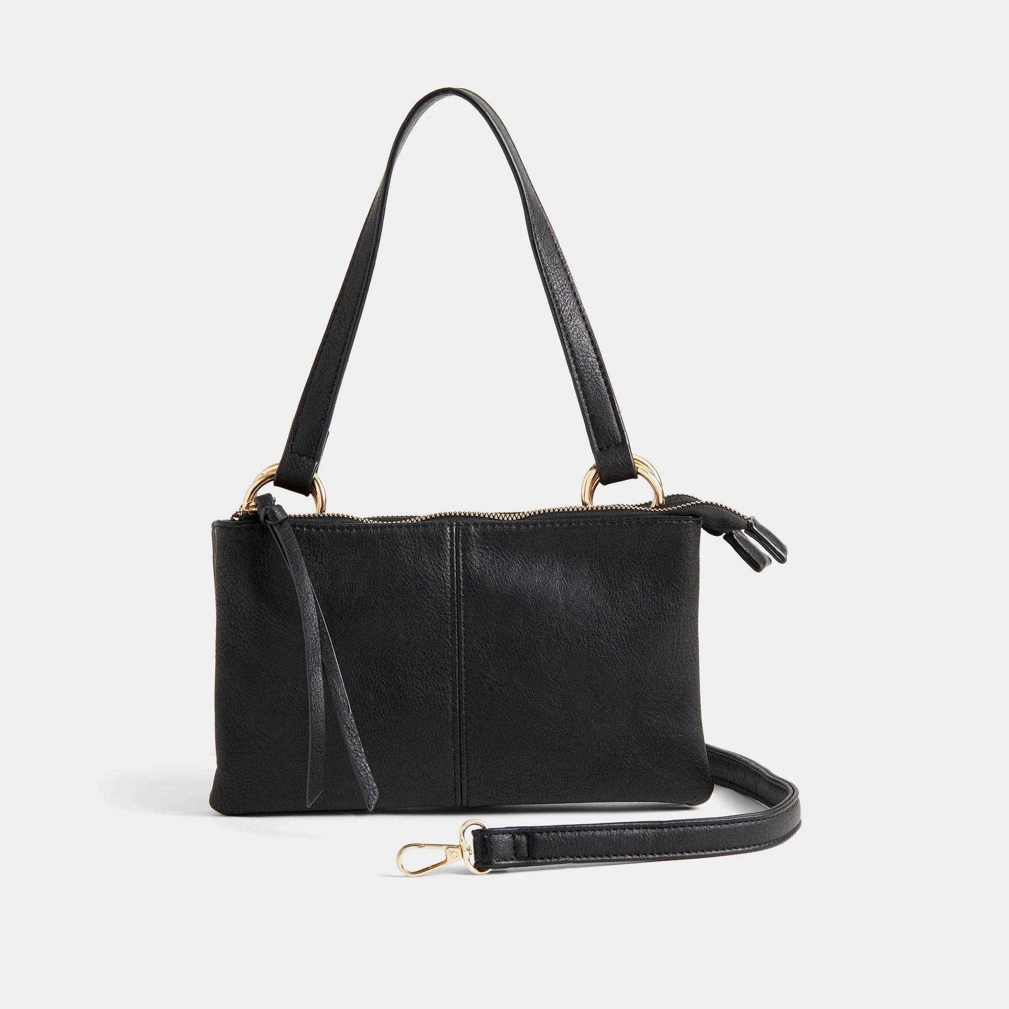 Chic and compact crossbody with two zippered compartments for easy organization. Carry multiple ways - with top handle or detachable crossbody strap.