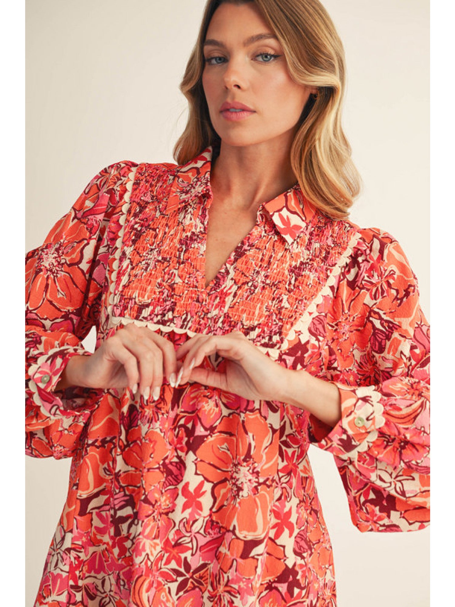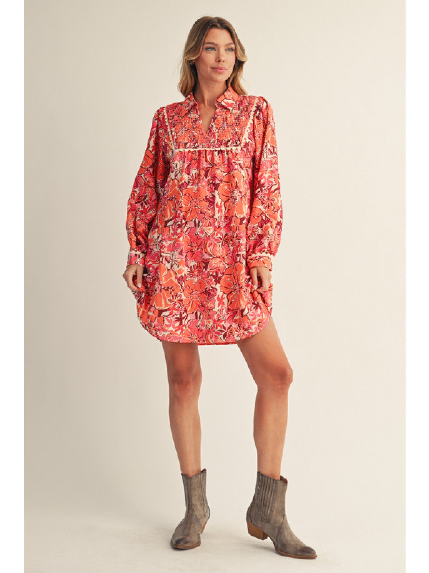 Embrace cozy fall vibes with this flowy long-sleeve dress in warm orange floral tones. The delicate ric rac trim adds a subtle touch of charm, making it perfect for crisp autumn days. Lightweight and airy, it moves effortlessly with you while keeping your look fresh and playful.