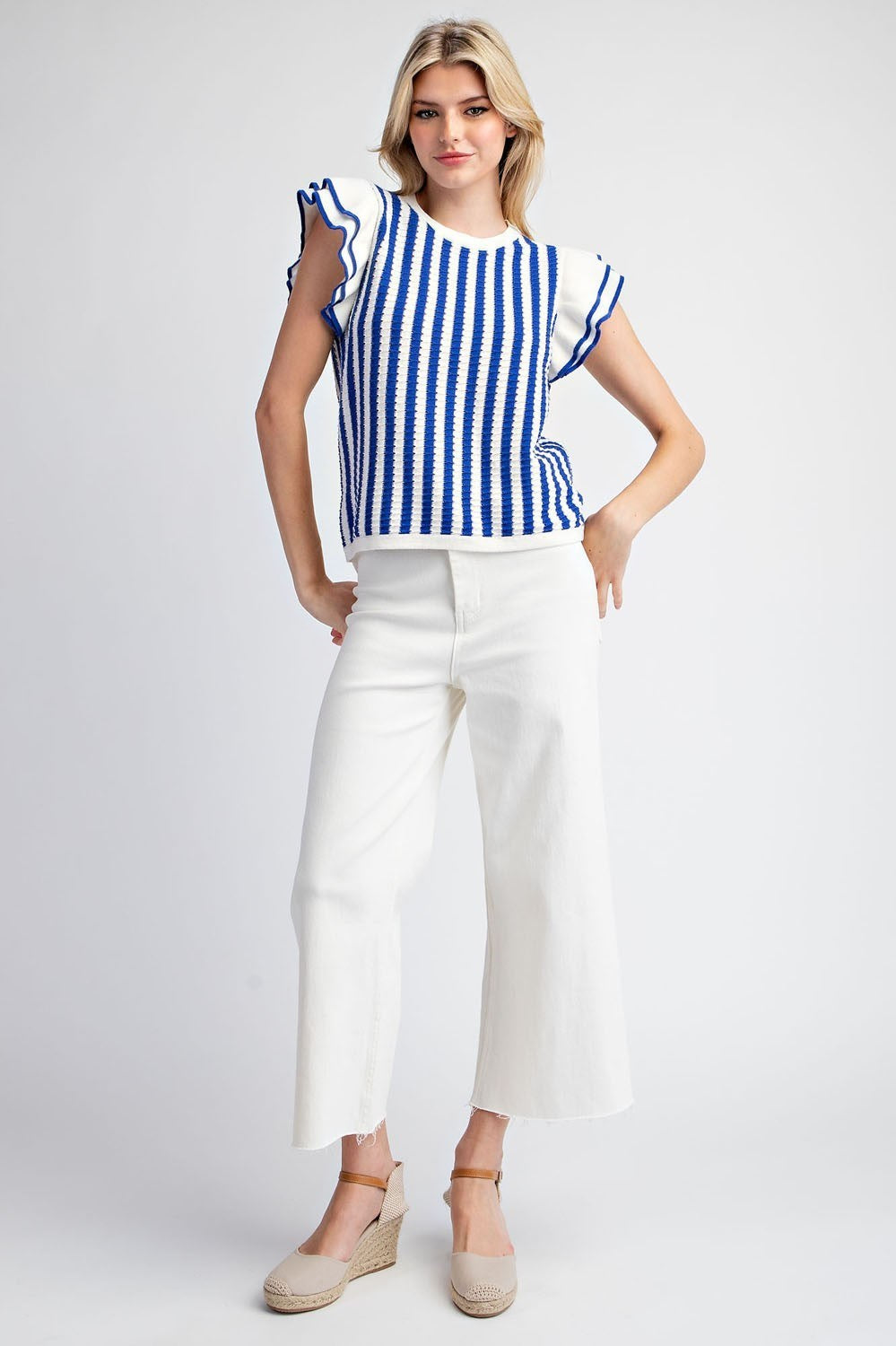 Get ready to be the style statement in the room with our Saylor Striped Sweater Top! The vertical striped pattern and ruffle sleeves add a touch of playfulness, while the bold royal blue color is sure to turn heads. Made with sweater material, this top is not only stylish but also comfortable with a stretchy and flattering fit.