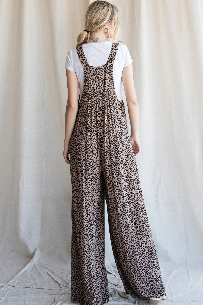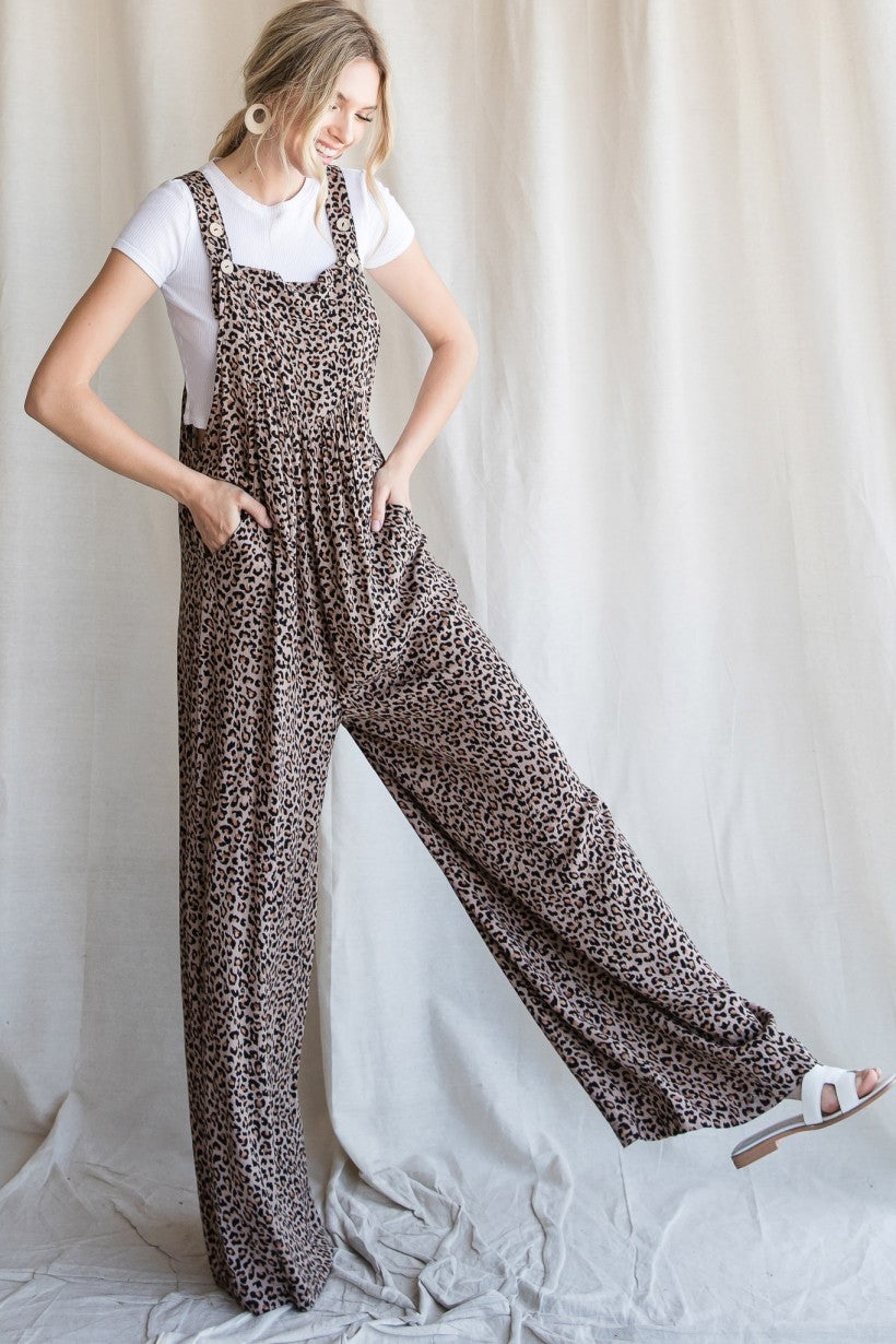 Effortlessly chic and undeniably comfortable, this taupe leopard jumpsuit brings together style and practicality. The wide-leg silhouette flows beautifully while ruched detailing adds subtle dimension and visual interest. Functional front button straps and hidden side pockets make this piece as wearable as it is fashionable. Perfect for casual outings or dressed-up occasions, it's the one piece that does it all.