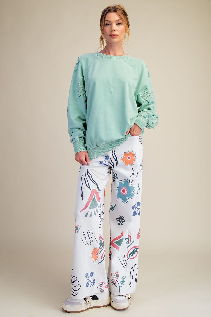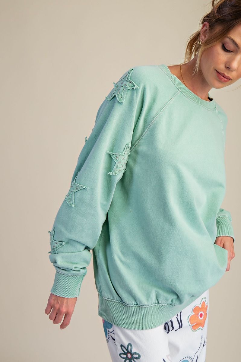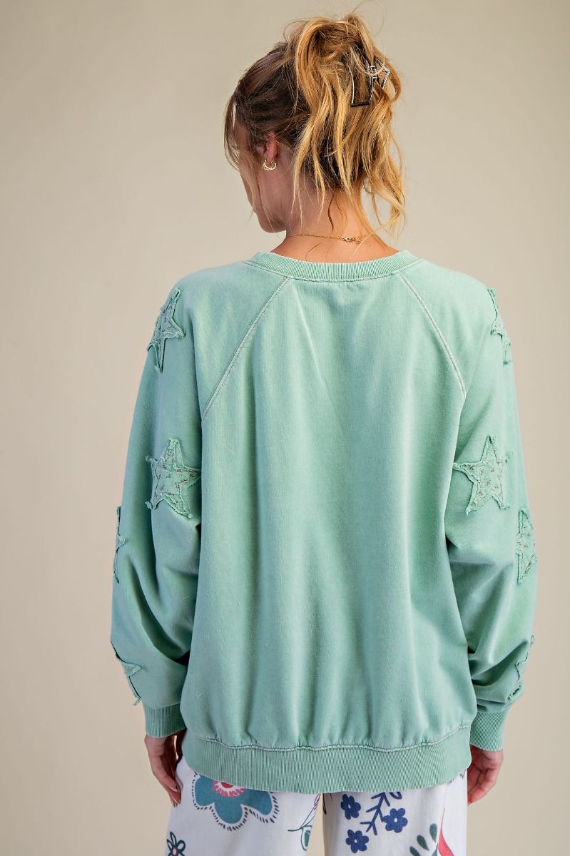 This Star Crossed Pullover in sage features charming floral star patches on the sleeves, adding a touch of whimsy to your cozy look. Perfect for cooler weather, its soft fabric keeps you comfortable while the playful design brightens up any outfit.