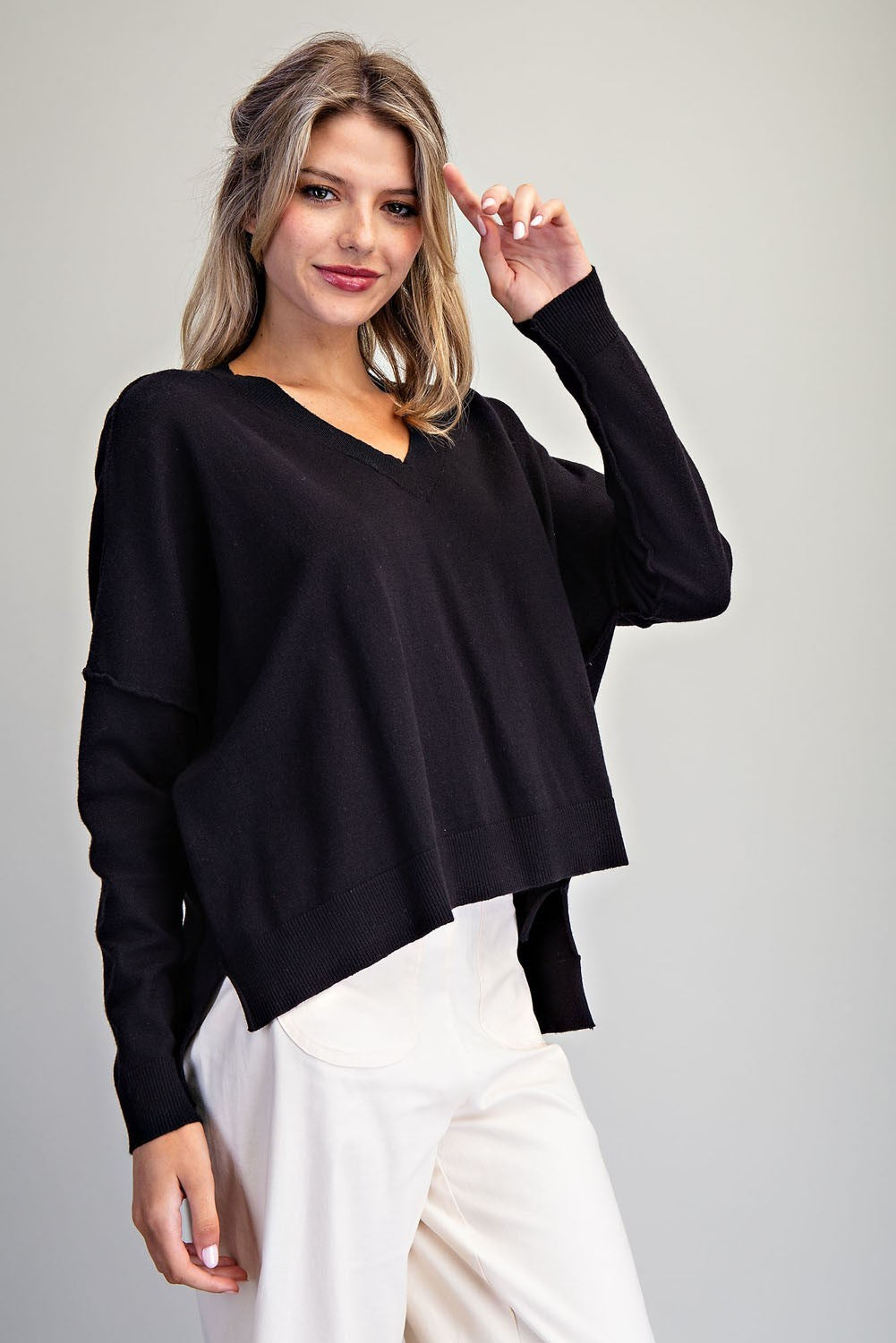 This relaxed long sleeve knit top features a soft V-neckline, dropped shoulders, and ribbed trim at the cuffs and hem, finished with side slits and a boxy silhouette for an effortlessly laid back look