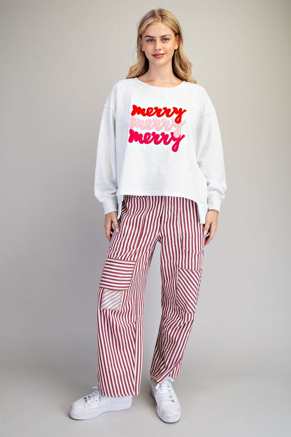 This festive pullover features a round neckline, dropped shoulders, and long sleeves with ribbed cuffs, finished with a relaxed high-low hem and bold triple "merry" lettering accented with a touch of glitter for a playful holiday sparkle.