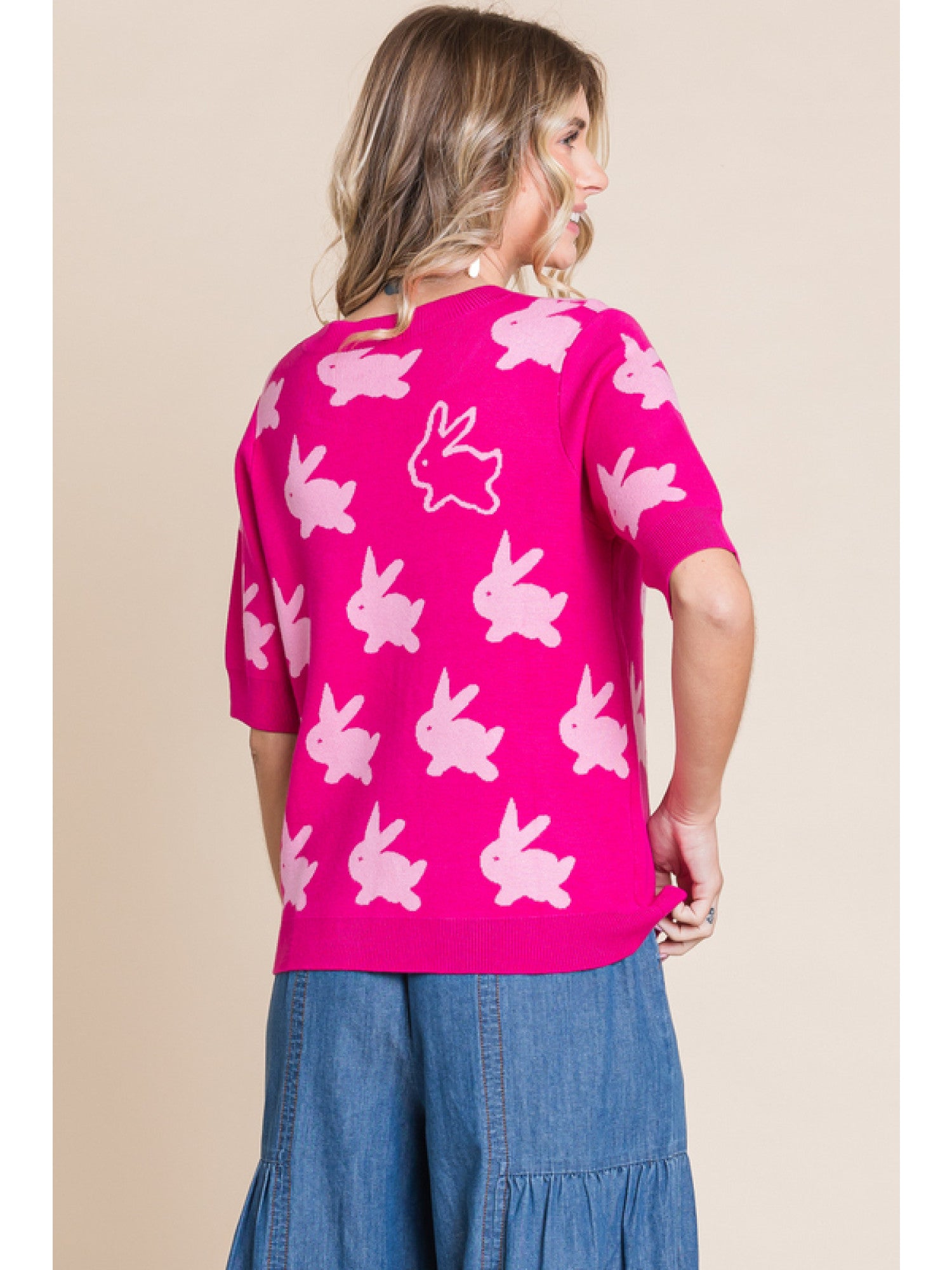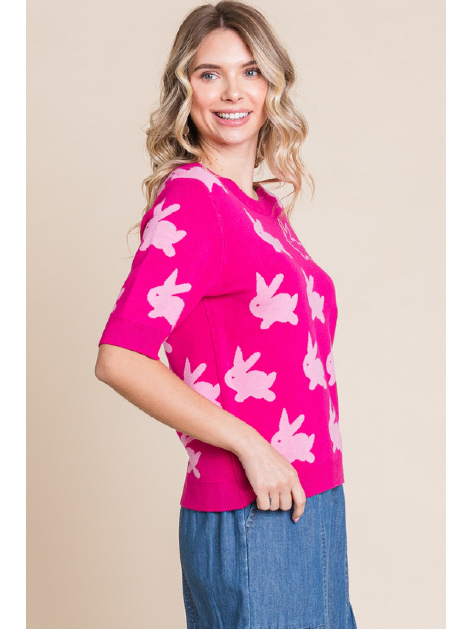 Hop into the Easter spirit with our Bunny Love Sweater Top! This cozy, hot pink sweater is adorned with a playful bunny print, making it the perfect choice for a fun and festive outfit. Made with sweater material, you'll be warm and fashionable all season long. Have a hoppin' good time with this unique piece!
