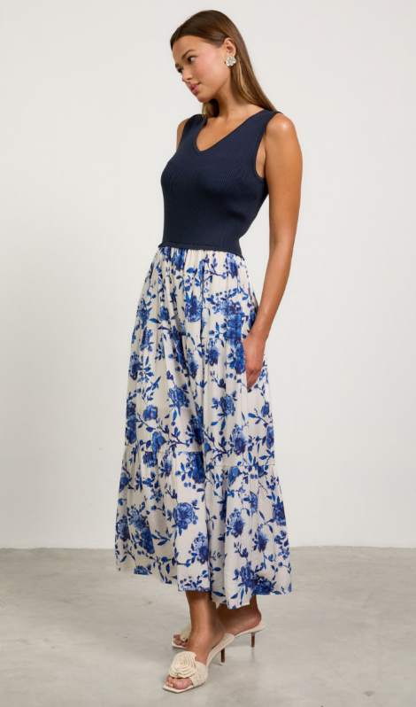 This dress is perfect for spring and summer, with its woven tank top and flowy maxi skirt adorned with a beautiful blue floral print. Comfortable and stylish, it's the perfect piece for all your daydreams. Available in sizes XS-L.