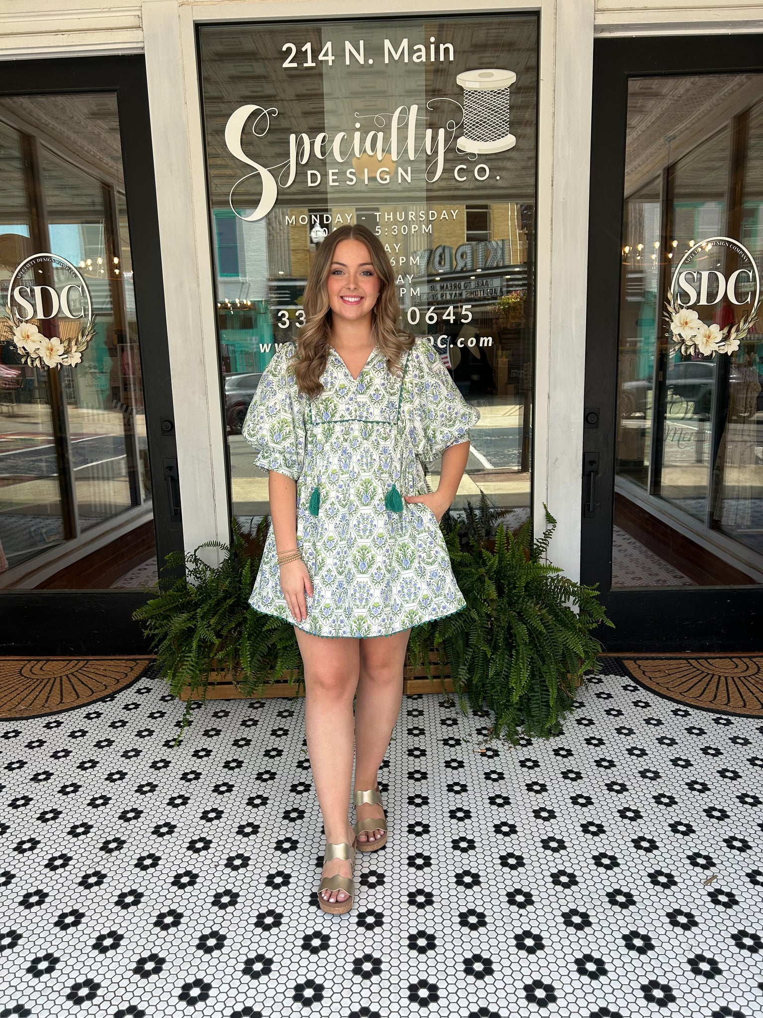 Twirl into spring with our Emerald Isle Mini Dress! This playful green frock features a charming honeycomb floral pattern and statement bubble sleeves that add just the right amount of drama. The scalloped trim adds a whimsical touch, while hidden side pockets (yes, pockets!) make this dress as practical as it is pretty. Perfect for garden parties or brunch dates!