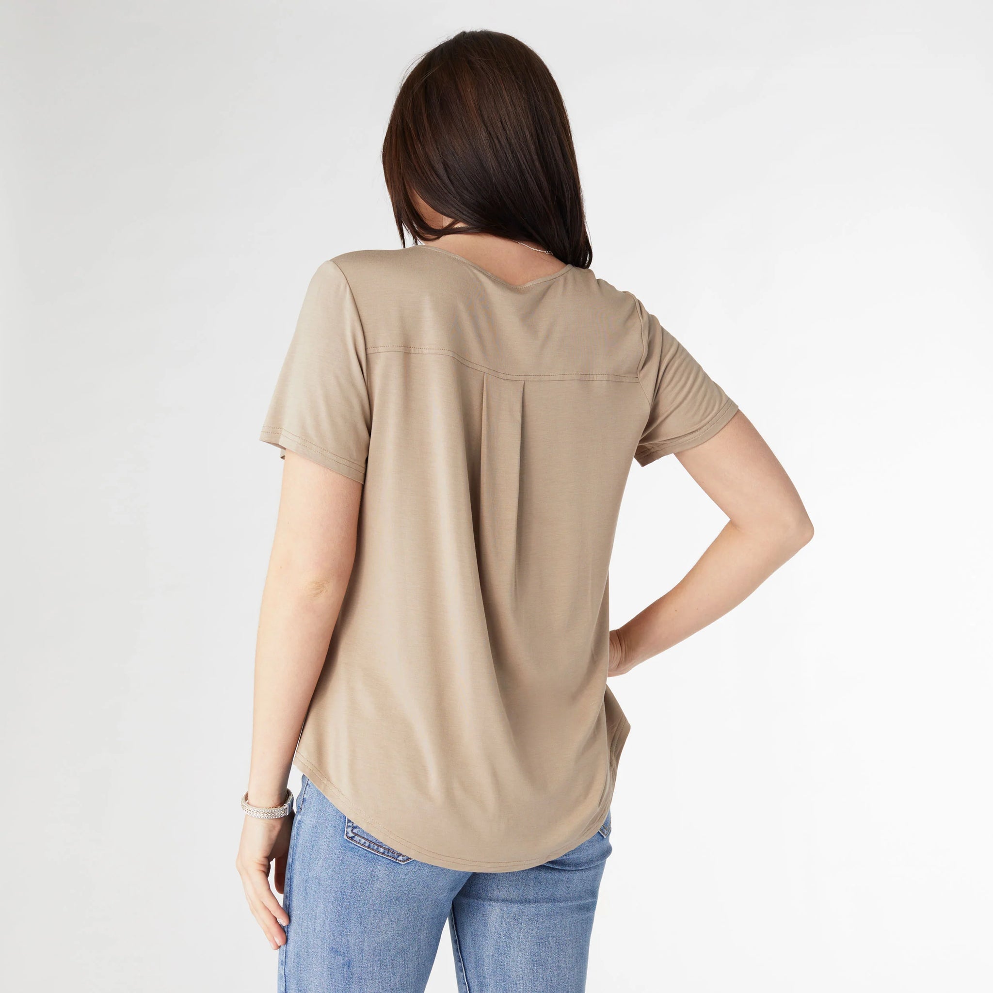 The Erin Pleat Back Tee is a must-have addition to your wardrobe! With its short sleeves and lightweight fabric, it's perfect for staying cool and comfortable all day long. Its unique pleat back design adds a touch of elegance, while the curved hem creates a flattering fit. Available in various colors, this tee is versatile enough to be dressed up or down for any occasion. Whether you're heading to the office or enjoying a casual outing with friends, this tee will become your go-to choice!