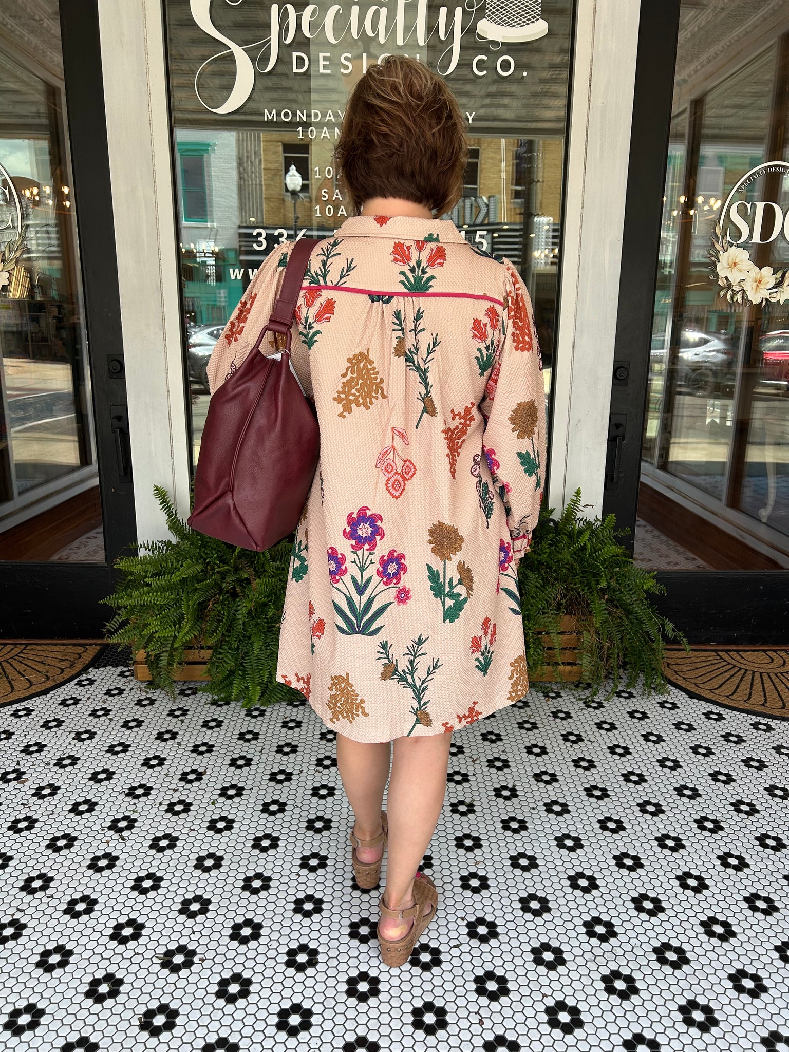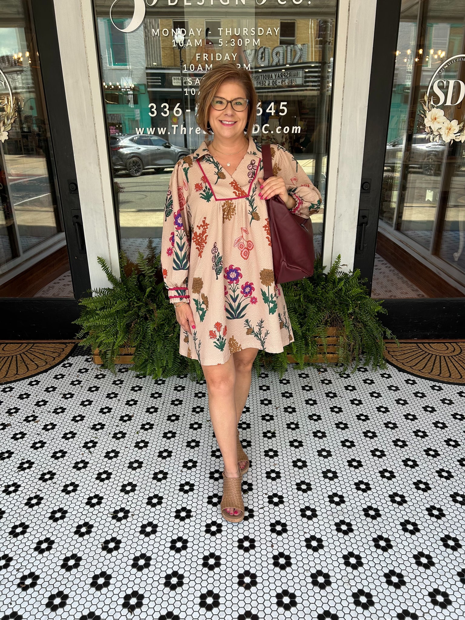 The Flawless Floral Dress features a vibrant fall floral print in bold colors. Its long sleeves and v-neck collared neckline offer a playful yet polished look perfect for seasonal style.
