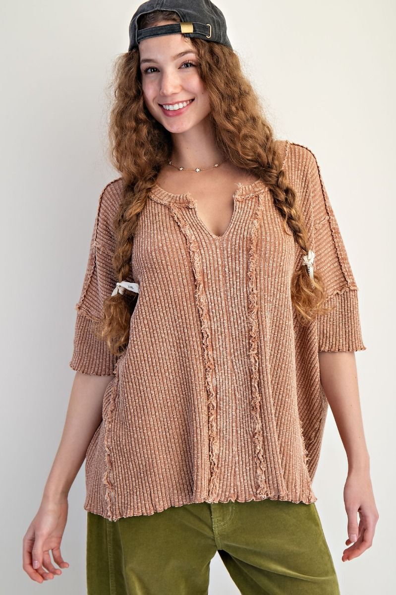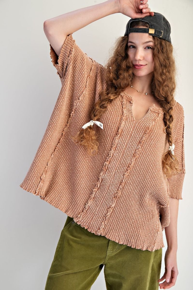 The Harlem Waffle Top in mocha offers a loose, comfortable fit with a playful v-neck and raw hem detail. Its waffle knit texture adds cozy warmth and subtle style, making it an easy choice for relaxed, everyday wear.