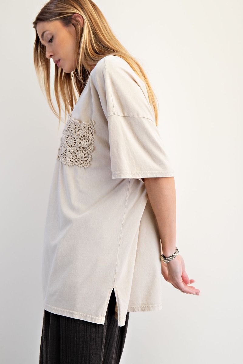 The Kaelyn Crochet Pocket Tee offers a relaxed fit with a playful twist. Featuring a delicate crochet pocket and a classic crew neck, this tee keeps things simple yet fun. Perfect for adding a subtle touch of charm to your everyday look.