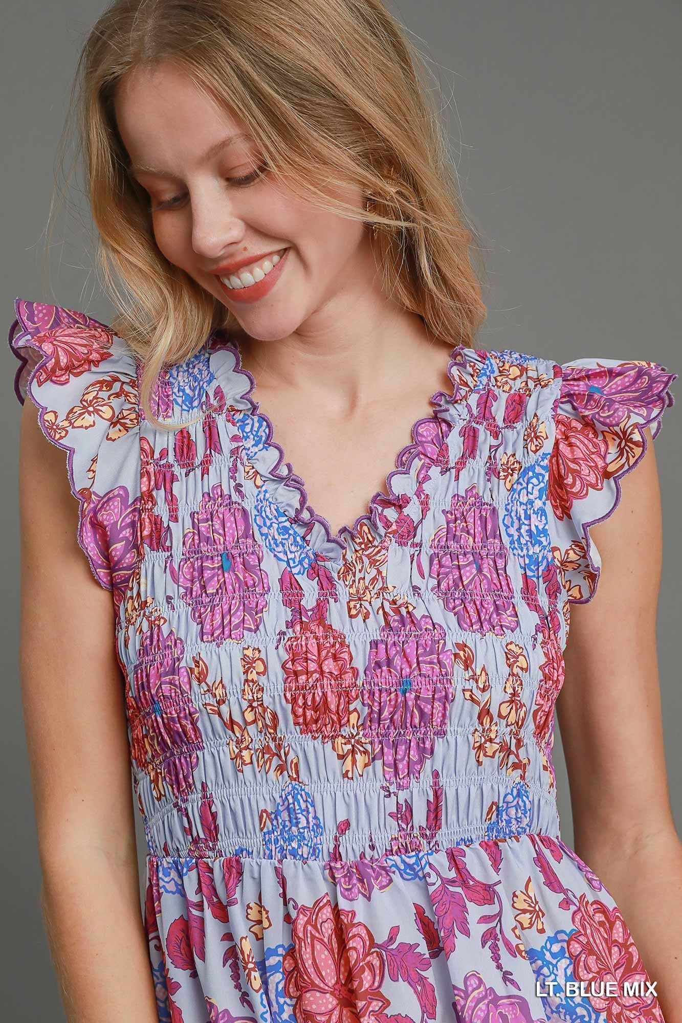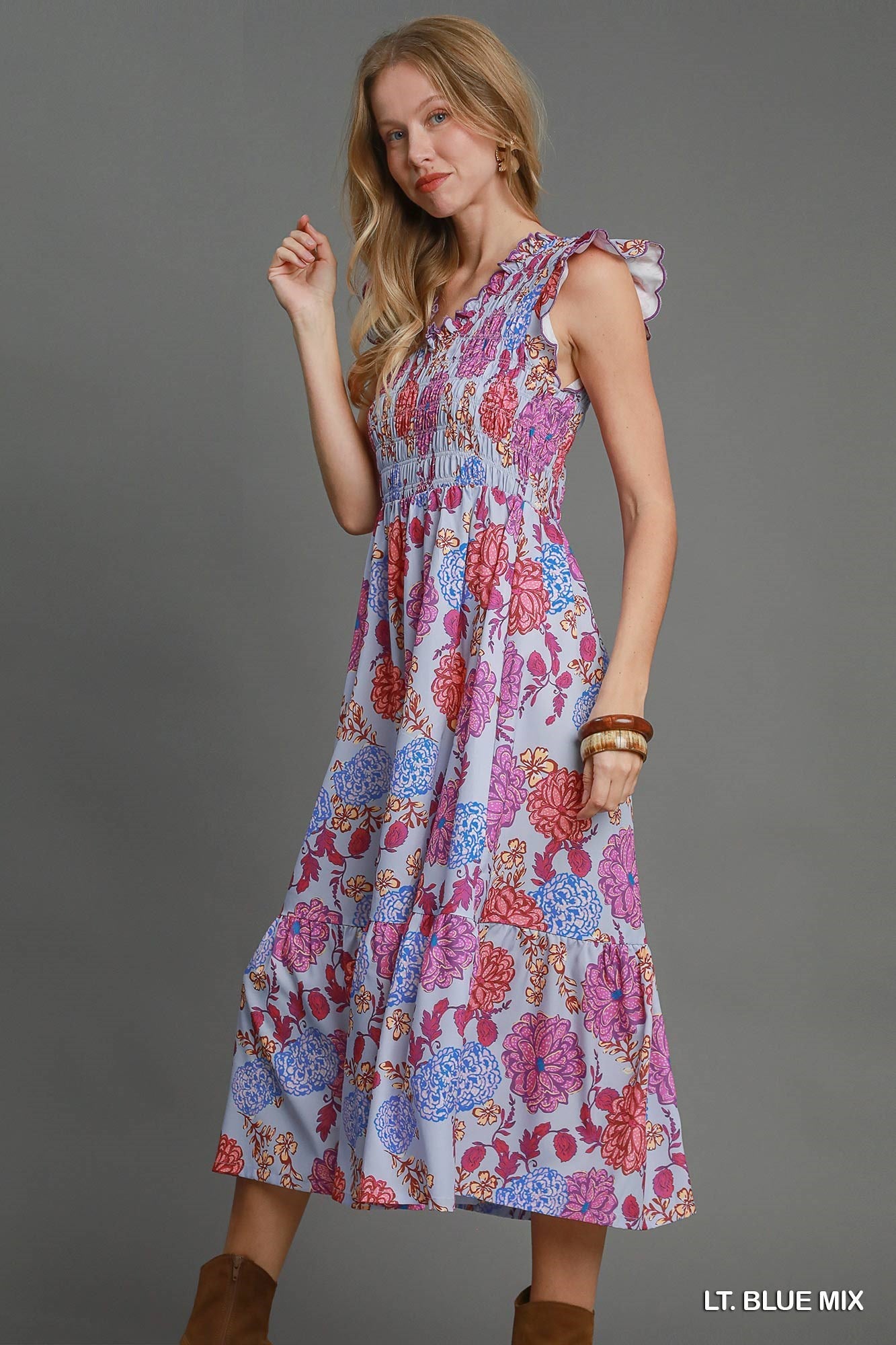 Add a pop of color to your wardrobe with the Lia Floral Midi Dress. Featuring a bright and colorful floral print, ruffle sleeves, and a smocked bodice for the perfect fit. With its flowy and comfortable midi length, this dress is perfect for any occasion.