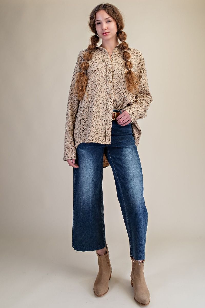 The Magnolia Floral Button Down in khaki features a vintage floral pattern and a relaxed oversized fit with dropped shoulders. Its collared neckline and button-down design make it perfect for layering or wearing on its own, combining comfort with effortless style.