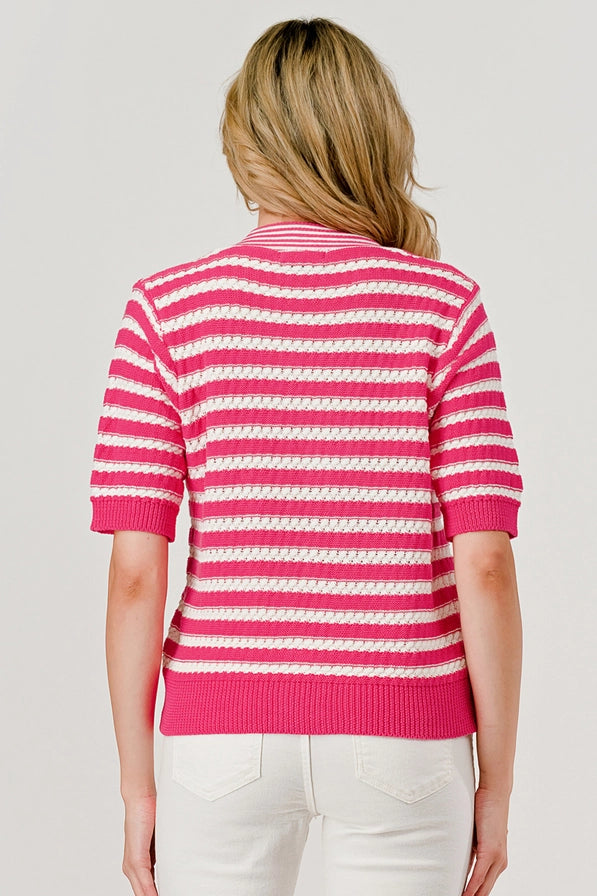 The pink Georgia Knit Bow Top offers a comfy, short-sleeve design that works beautifully as a cardigan or a standalone piece. Its lightweight style makes shifting your wardrobe from summer to fall effortless, all while keeping a playful and minimal feel.