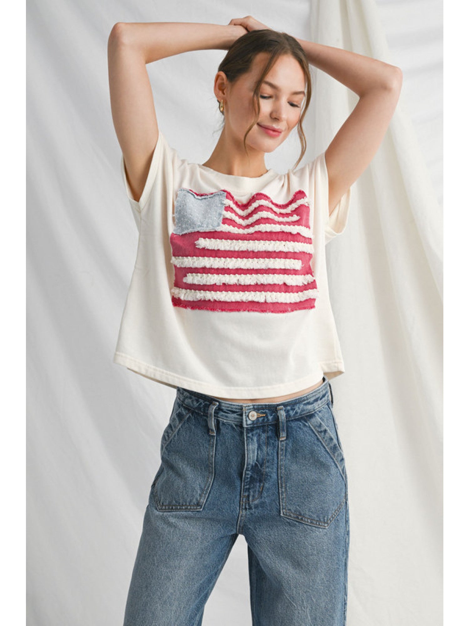 This cream top offers vintage vibes with a bold flag design and fringe accents. Drop shoulders and a slightly cropped fit create a relaxed, playful silhouette perfect for a casual 4th of July look!