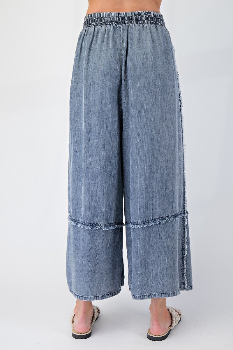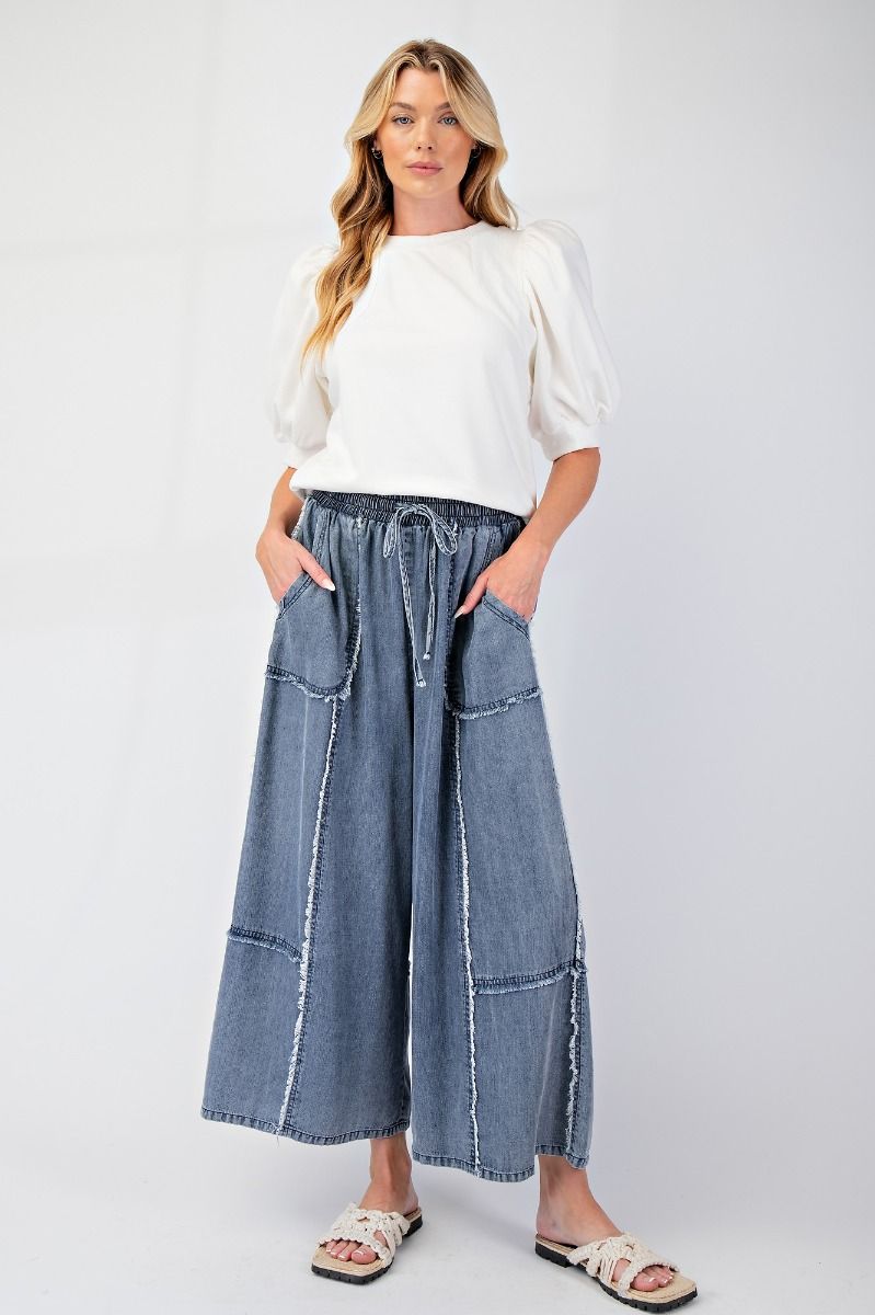 Get ready to rock some serious vintage vibes with our Rhiana Denim Pants! These flowy, tie-waist pants are both comfy and stylish, with a cropped length and convenient pockets. Perfect for a laid-back yet fashionable look.