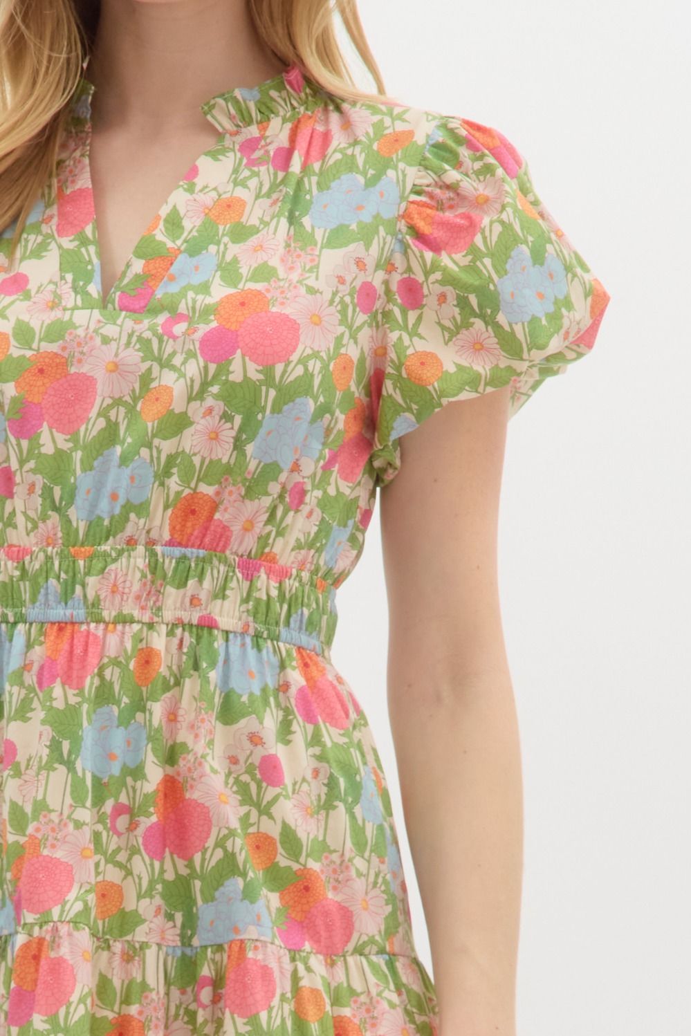 This flowy dress features a beautiful floral print, bubble sleeves, and a comfortable elastic waistband. The tiered style creates a stylish and flattering silhouette. Perfect for any occasion, this dress will have you feeling as light and carefree as a summer breeze.