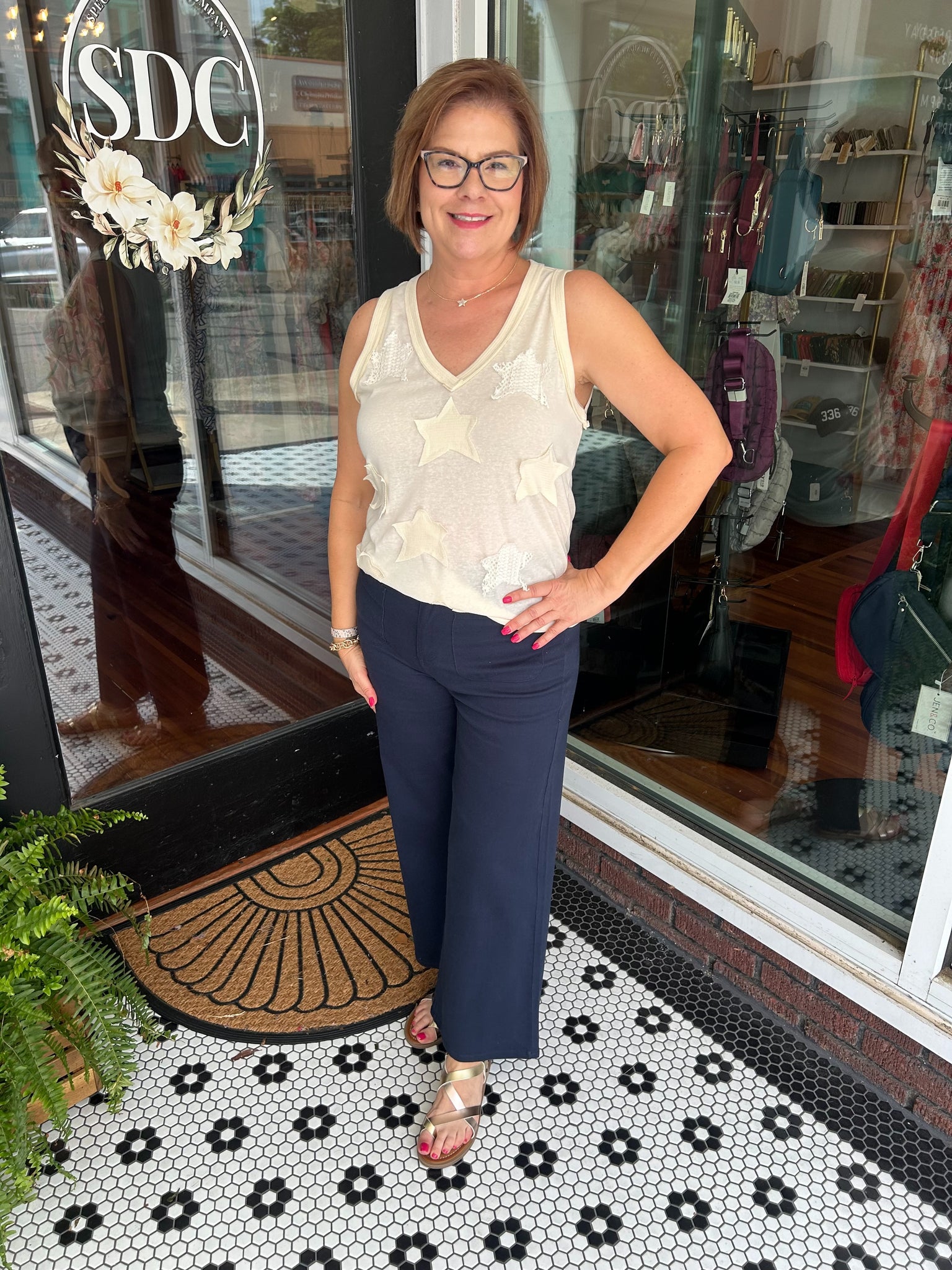 Sparkle through summer in this cream knit tank with whimsical star patches. Soft, breathable fabric keeps you cool while adding a touch of patriotic fun to your 4th of July look. Simple yet statement-making—just how holiday style should be.