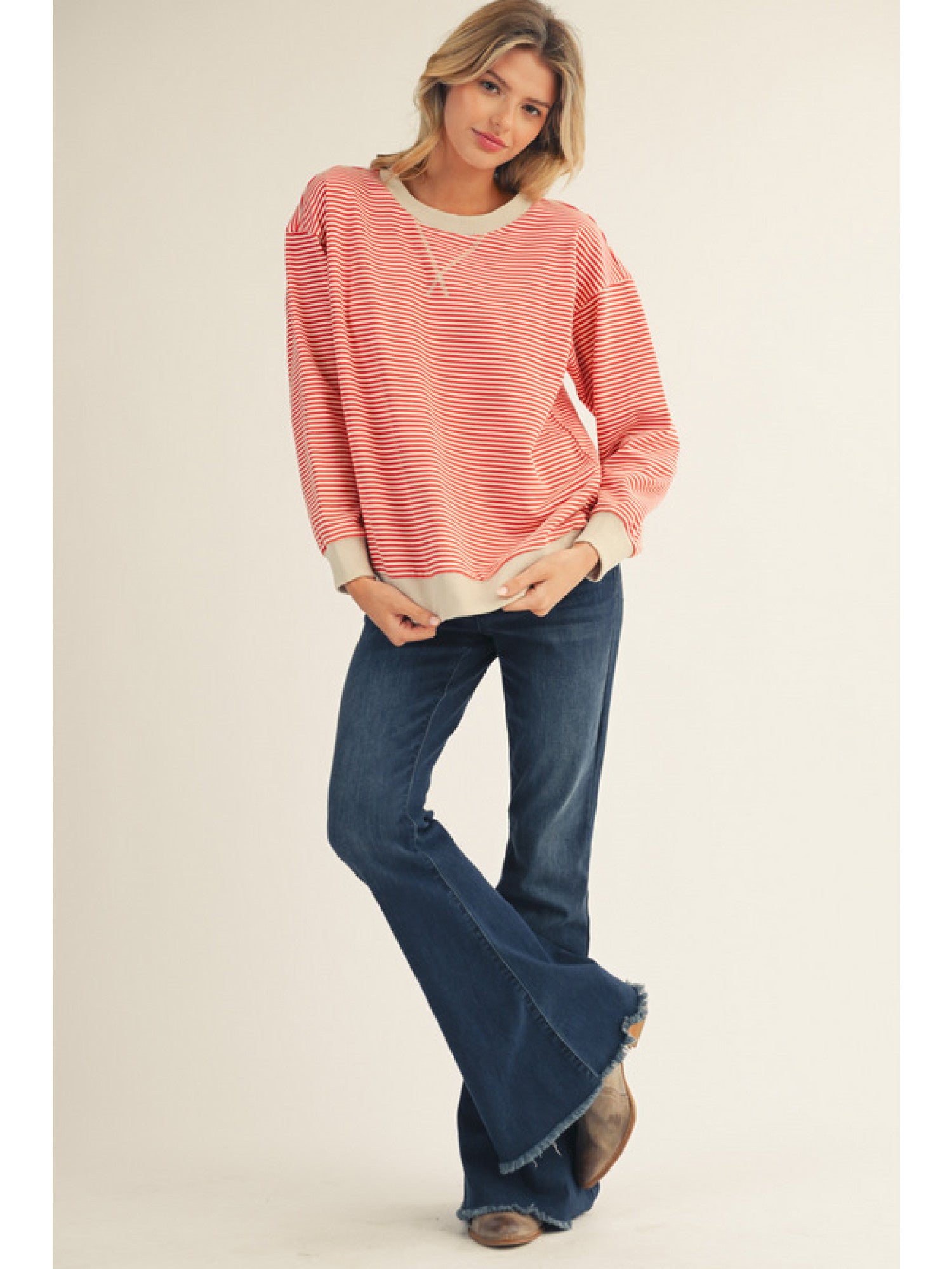 This relaxed-fit long sleeve top features classic red and tan stripes accented with a solid contrast trim for a sleek, modern look. Its comfortable cut makes it perfect for everyday wear with a playful edge.