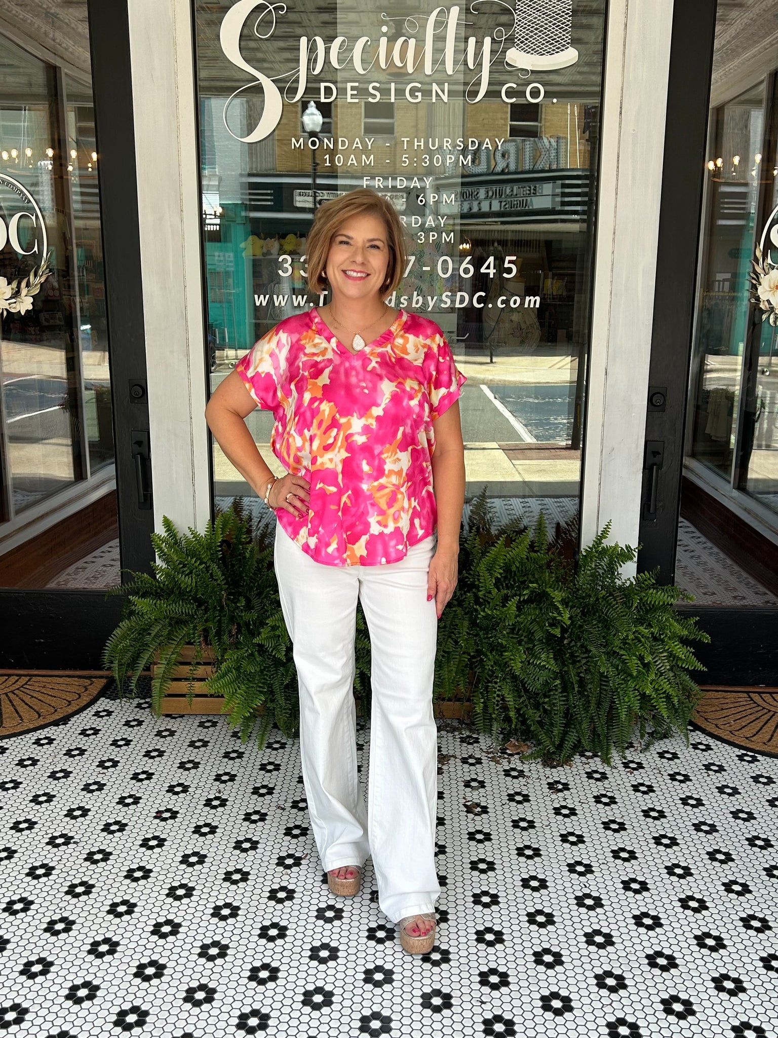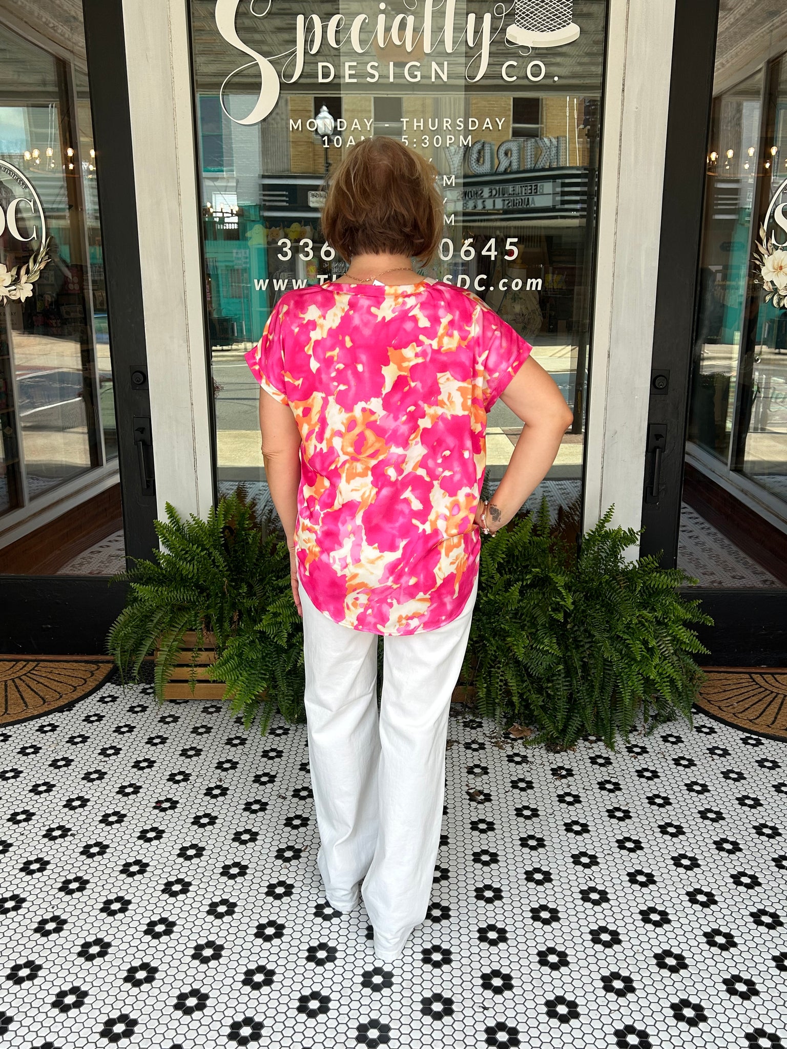 This Whitney Watercolor Top in hot pink features bright colors and a lightweight, flowy fabric that keeps you comfortable all day. Its short sleeves add a breezy touch, perfect for playful, effortless style.