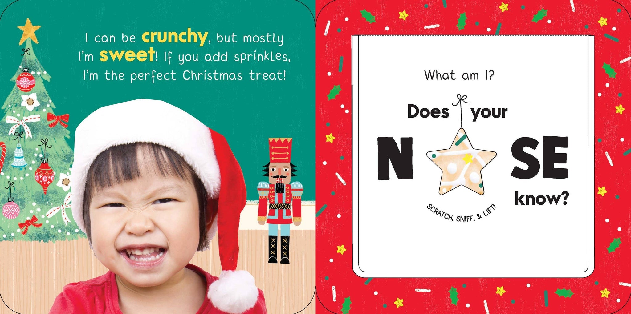 Does your child know what a Christmas tree smells like? A cup of hot chocolate? Play “guess that smell” to see if your toddler knows all the seasonal smells featured in this fun, interactive board book! Use the scratch and sniff cutout and other clues to try and guess each smell with your little one. Then, lift the flap to see if your guess is correct. Have fun as you learn how much your little one’s nose knows!Photos of toddlers and colorful artwork will delight and engage your child as they try to guess each smell