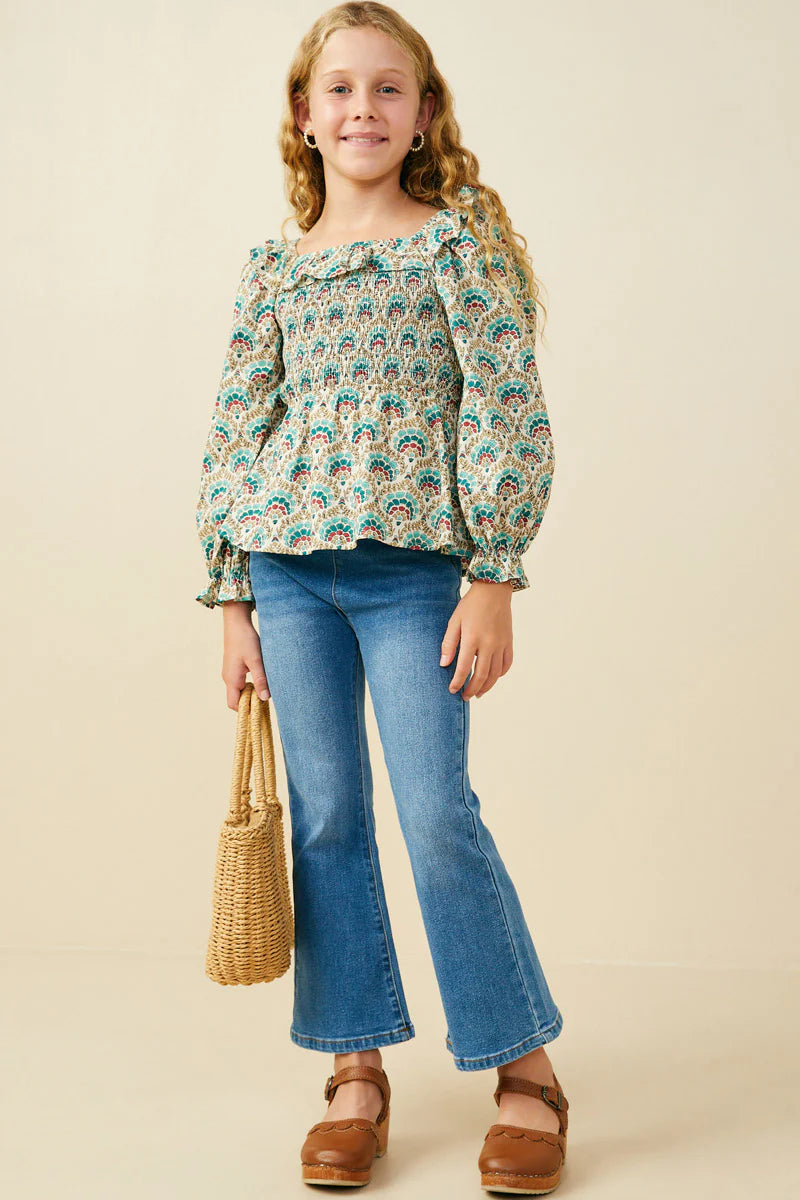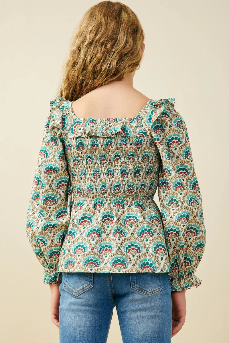 Charming smocked top featuring delicate ruffle details and a playful teal mix pattern. The gathered bodice creates a flattering silhouette while the ruffled trim adds movement and personality. Perfect for everyday wear or special occasions, this piece combines comfort with whimsical style.