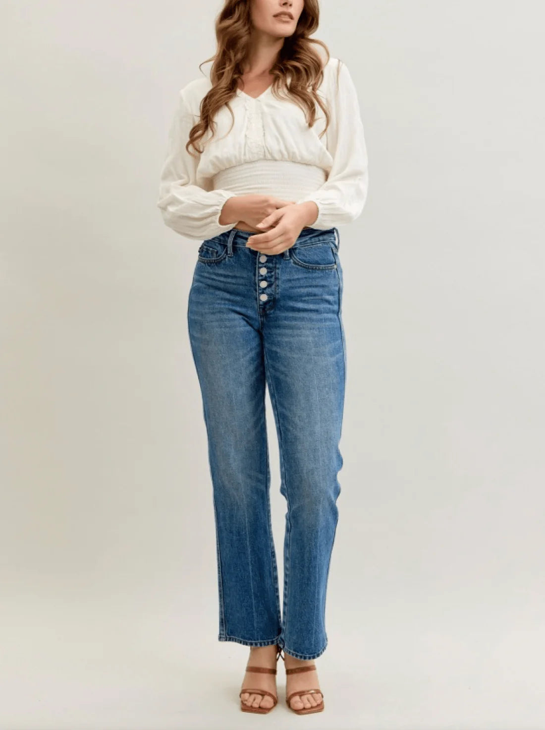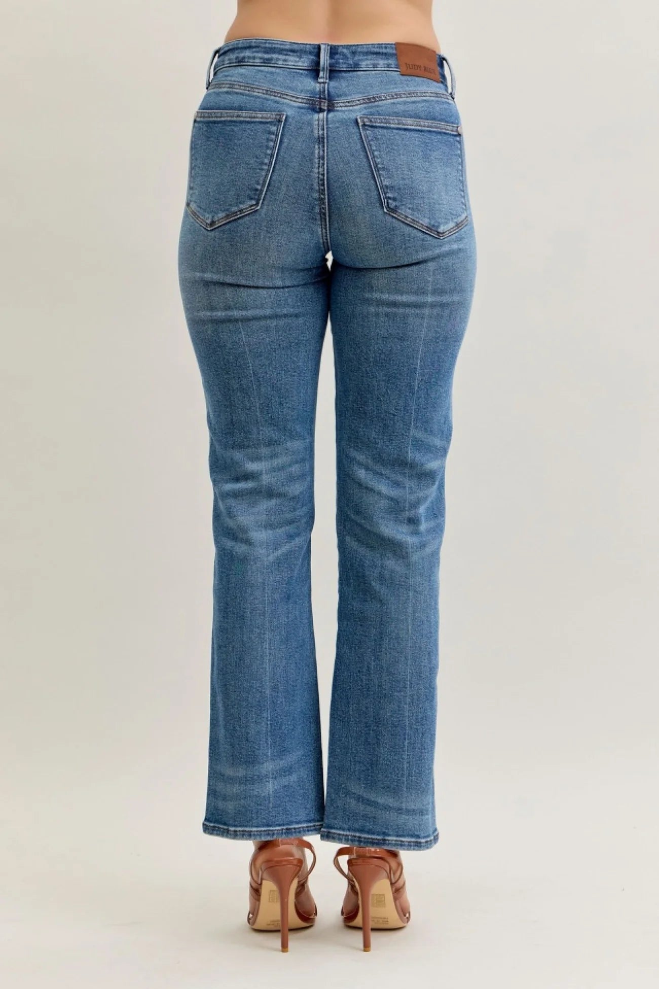 These blue wash Judy Blue straight-leg jeans combine modern edge with everyday comfort. Designed with Rigid Magic technology, they feature a rigid cotton front panel for a true denim look while maintaining Judy Blue’s signature stretch in the back for all-day comfort. The mid-rise fit and washed look add a laid-back, lived-in vibe, making them perfect for casual styling.