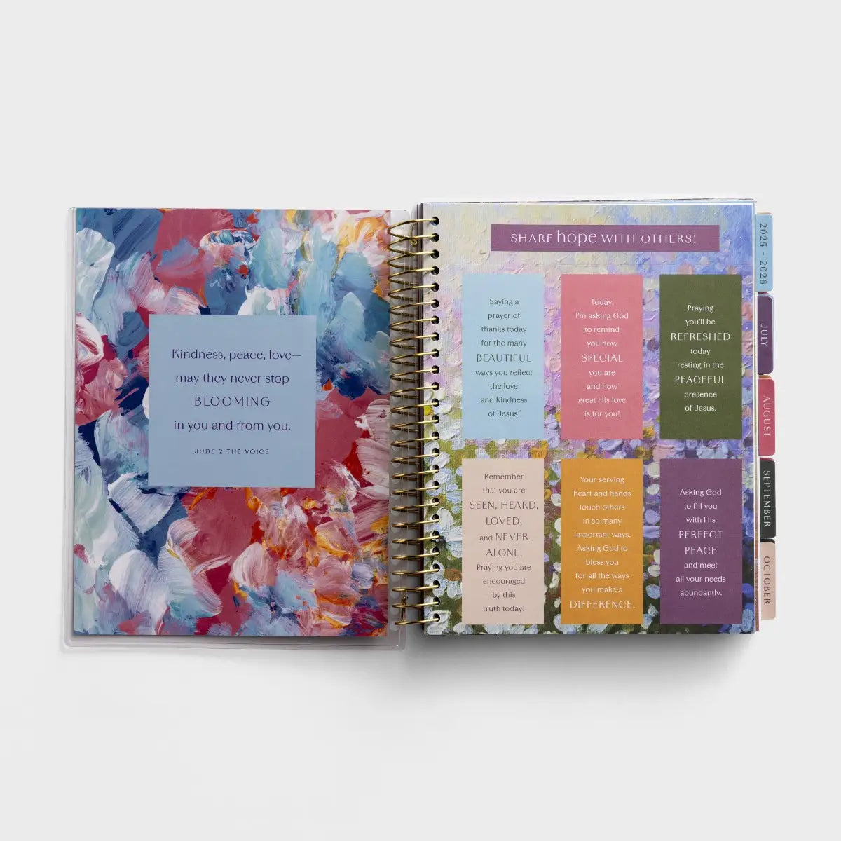 Plan with purpose using the Never Stop Blooming 18-Month Agenda Planner from DaySpring. Featuring fresh, colorful floral designs, this planner offers encouragement and Scripture for inspiration. The quality laminated cover and spiral binding ensure durability, while the horizontal weekly spreads provide ample writing space for appointments, meetings, lists, and notes. An extra pocket page helps keep loose items organized. Personalize your planner with colorful sticker labels for special events and reminders. Starting in July 2025 and ending in December 2026, it’s perfect for managing school schedules, sporting events, and church activities. As a bonus, you’ll receive 6 perforated prayers to share pass-along notes to help you share hope and inspire others. These fun little notes can be easily taped to a door or mirror, popped in a loved one’s bag or briefcase, tucked under a windshield wiper, or left (with a tip) for your server!