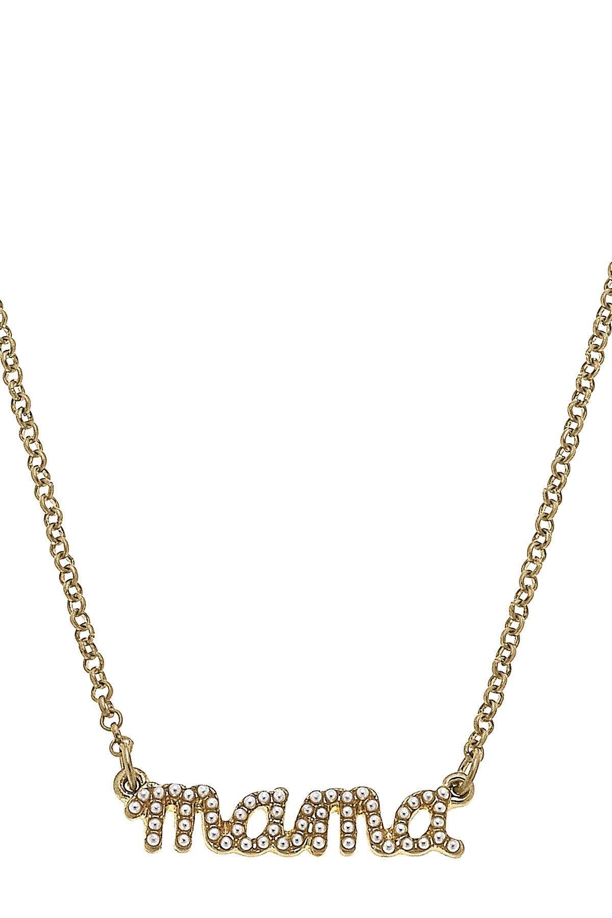 Add some elegance to your style with our Mama Pearl Studded Script Necklace in Worn Gold. This necklace features beautiful pearl studded script in a worn gold finish, adding a touch of sophistication to any outfit.