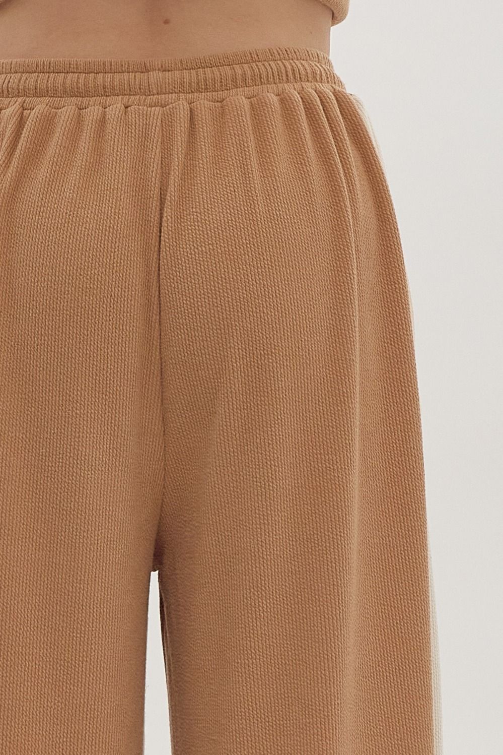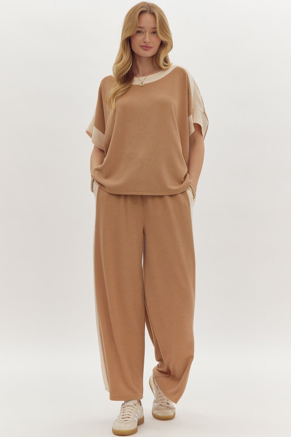 Get ready to lounge in style and comfort with our Cozy Chic Set Pants! These camel-colored pants feature a cream color block side detail and a wide leg design for a touch of luxury. Perfect for cozy nights in or running errands in style.