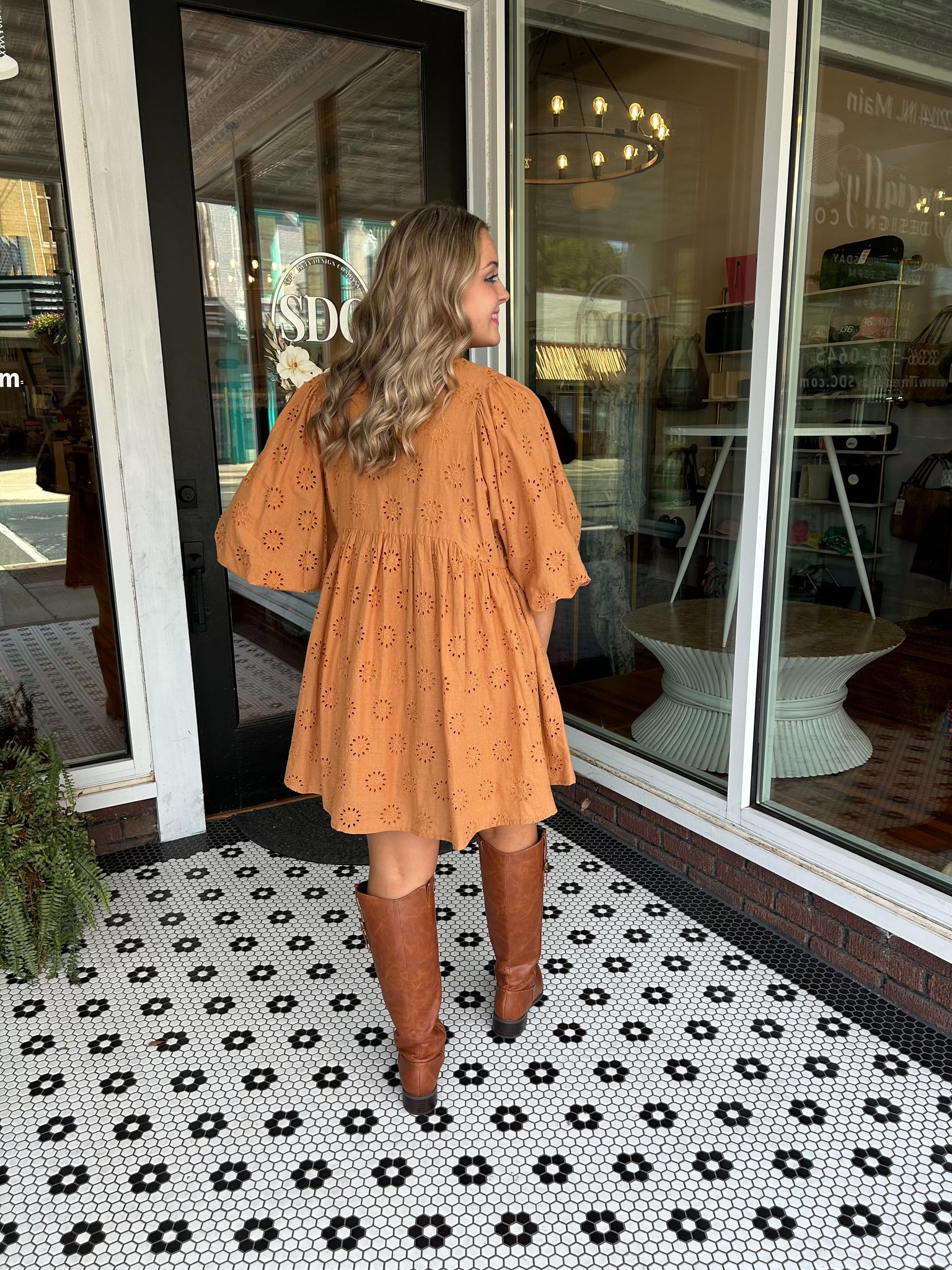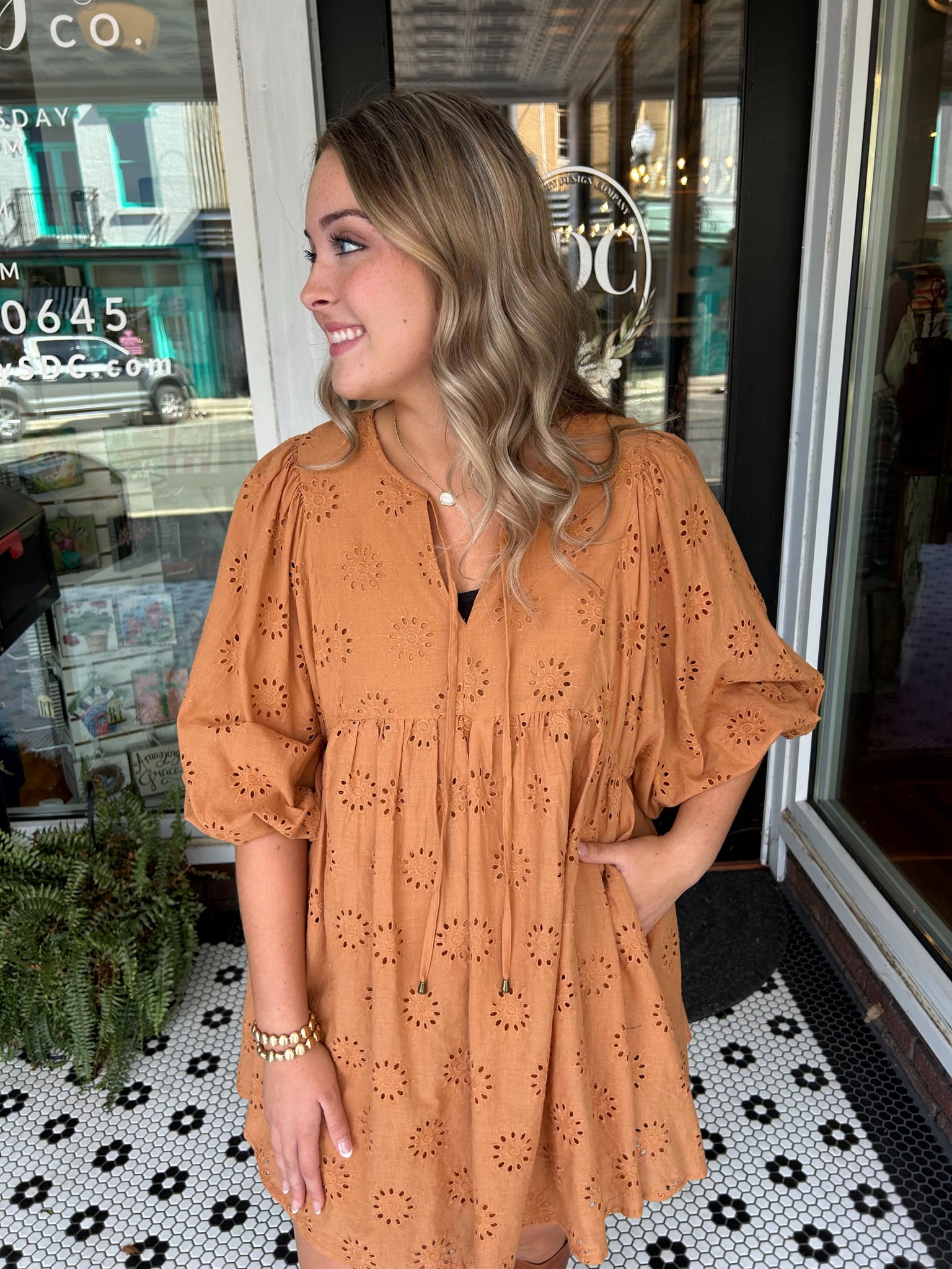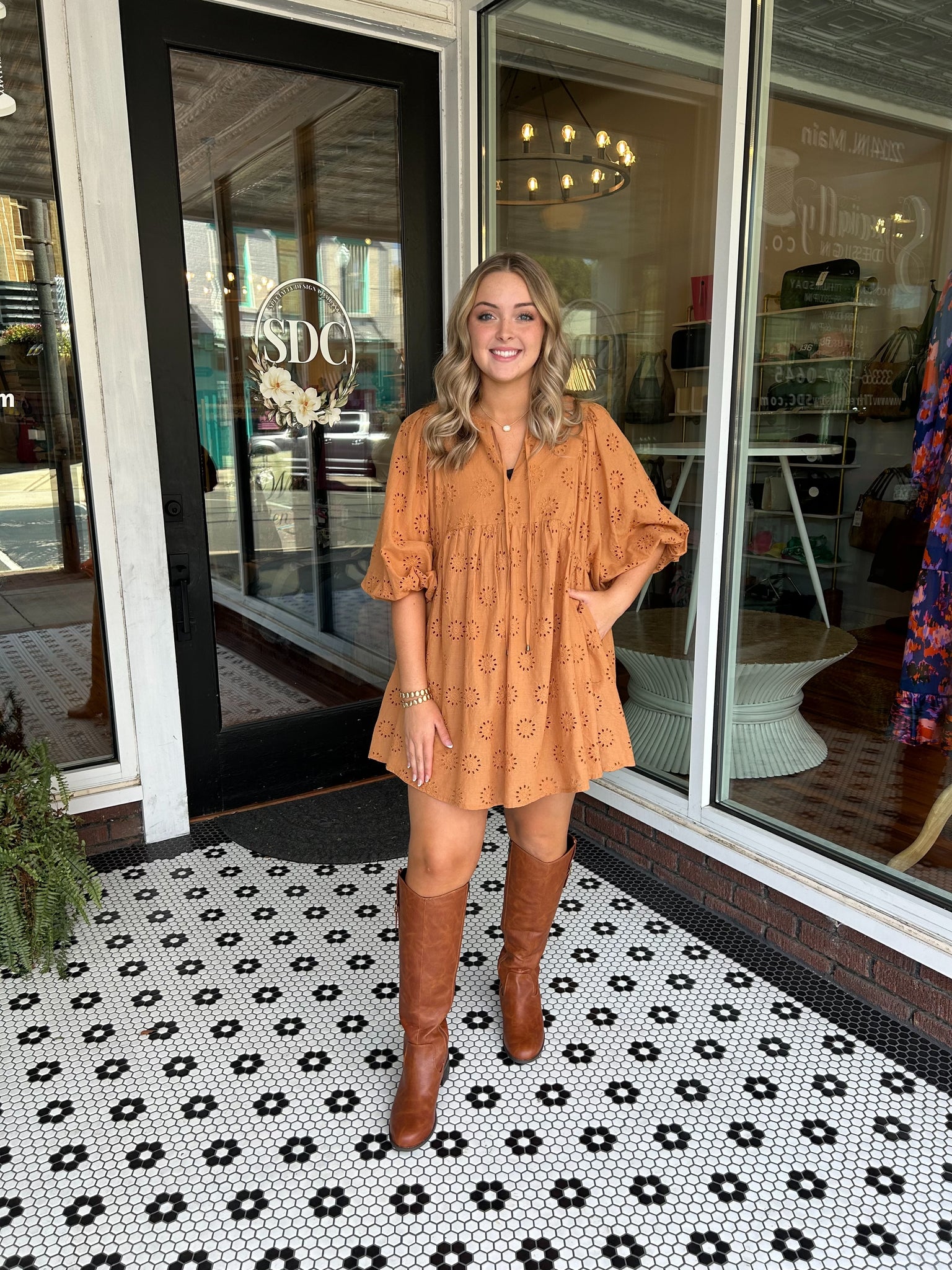 Get ready to look sweet as pie in our eyelet dress! This camel-colored dress features charming puff sleeves and a flattering v-neck, perfect for all your fall adventures. Don't miss out on this cute and stylish addition to your wardrobe!