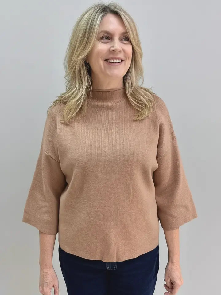 Introducing the Sherry Mock Neck Sweater. This medium weight sweater features a soft and cozy blend of viscose, poly, and nylon for ultimate comfort.