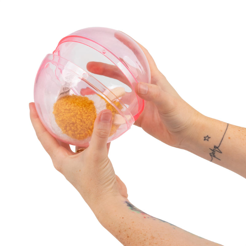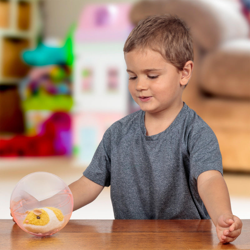 A life-size furry hamster which runs endlessly forward inside its plastic ball. Set the hamster running and it will scurry up the edge of the ball, making it roll forward. A clever swivelling mechanism on the underside of the hamster allows it to occasionally change direction, giving this electronic rodent a very life-like pattern of movement.
