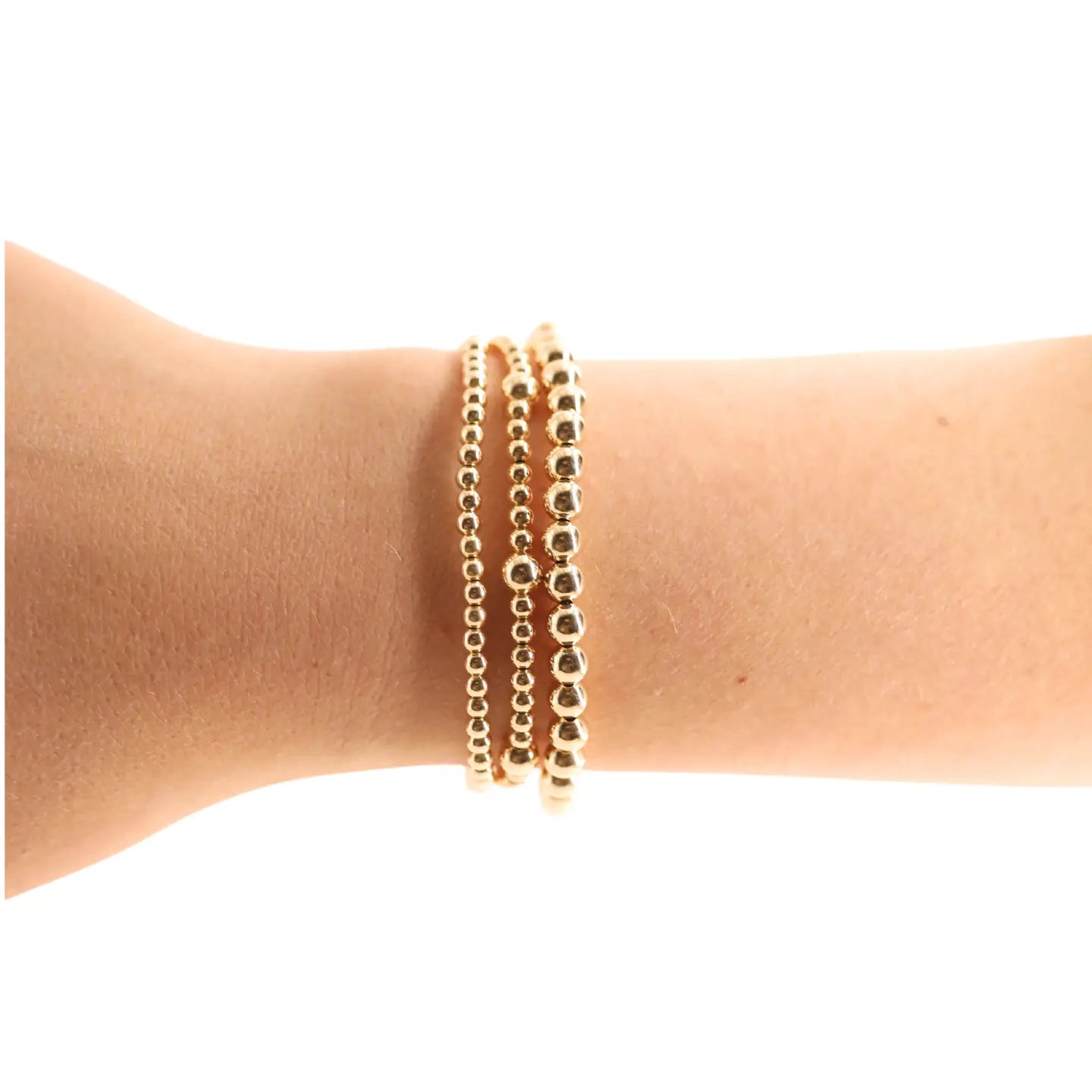 Beaded Blondes 5MM gold stackable beaded bracelet. • 14 K gold filled & elastic string. • Handstrung in College Station, Texas. Sourced in the US. • Waterproof, workout proof & tarnish proof.