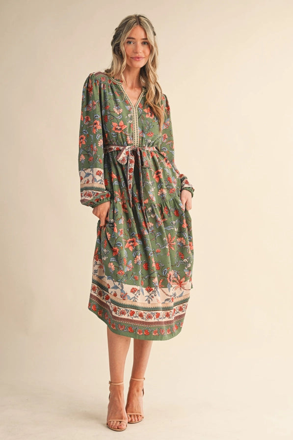 The Bethany Midi Dress brings effortless elegance with its mixed floral print in soft autumn tones. The adjustable belt lets you customize the fit to your frame, while the midi length offers versatile styling for any occasion. Perfect for layering through the seasons or wearing solo when the weather warms up.